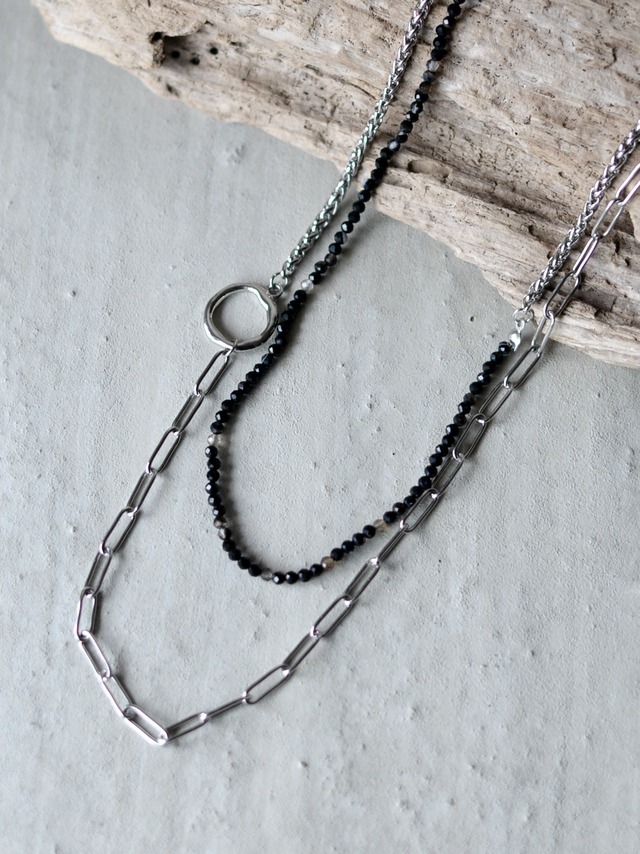ステンレスチェーン+天然石の異素材をMIXさせた2SETネックレス。 コーデや気分に合わせ、2連にしても別々にもお楽しみ頂けます。 細身のスネークチェーンはカニカンで簡単に取り外し可能となり、チェーン単体でもご使用可能です。 5wayとして活用出来るので、これ1つで様々なシーンに活躍できる便利で優秀なアイテムとなっています。お好みのカスタマイズでお楽しみ下さいませ。 ▼天然石 ブラックオニキスは古くから悪を退けるといい、身を守るお守りとして用いられていたようです。 ※天然物の為、1つ1つ色味やサイズが異なります。 ▼素材 ステンレス ▼サイズ ・ロング 全長 約66cm ・ショート 全長 約59cm **********オプションからお選び下さい********** ▼ラッピング +¥200にてラッピングを承っております。 ********************************************** ▼ご配送日程 約1〜2週間程お時間を頂いております。