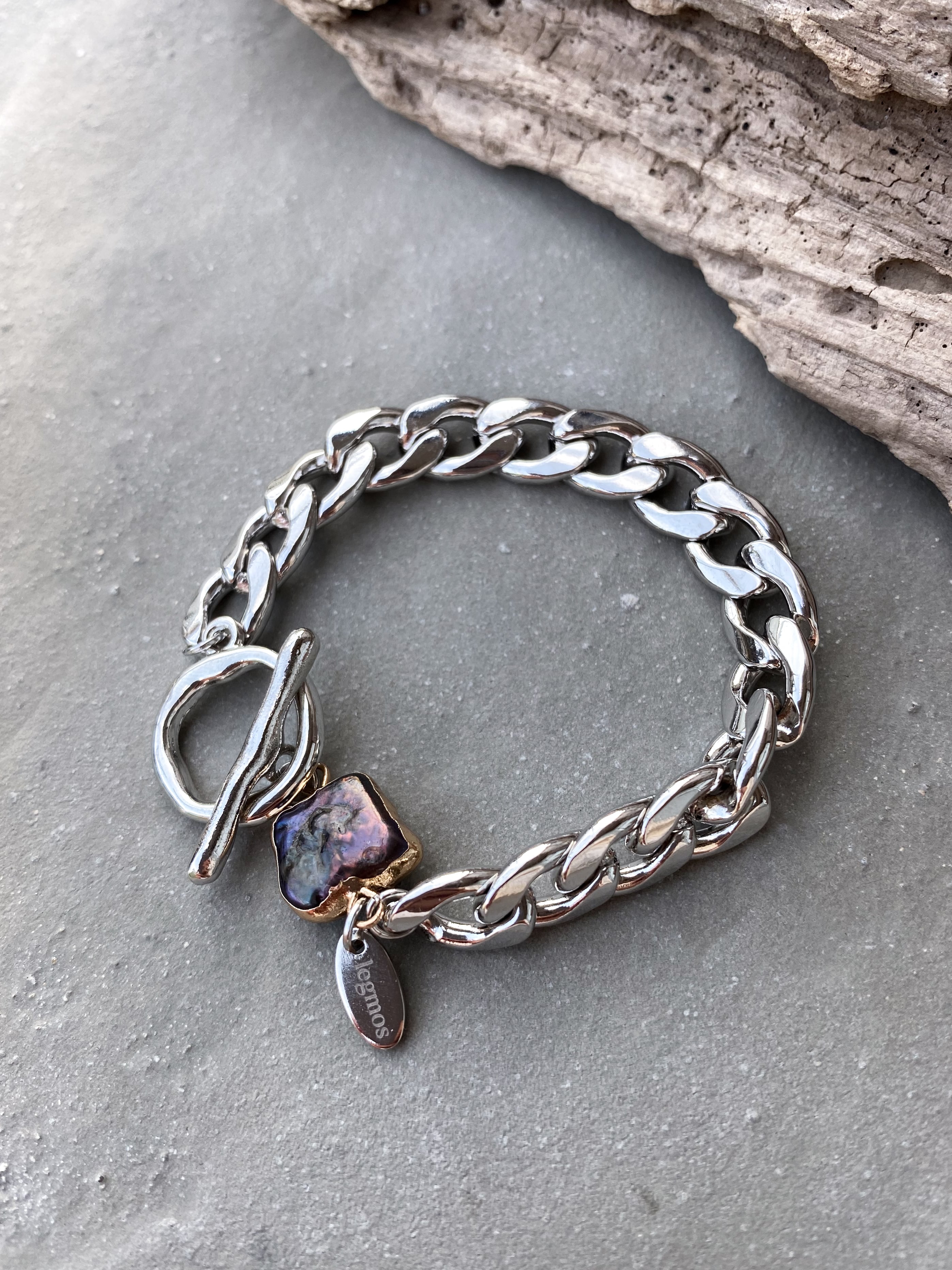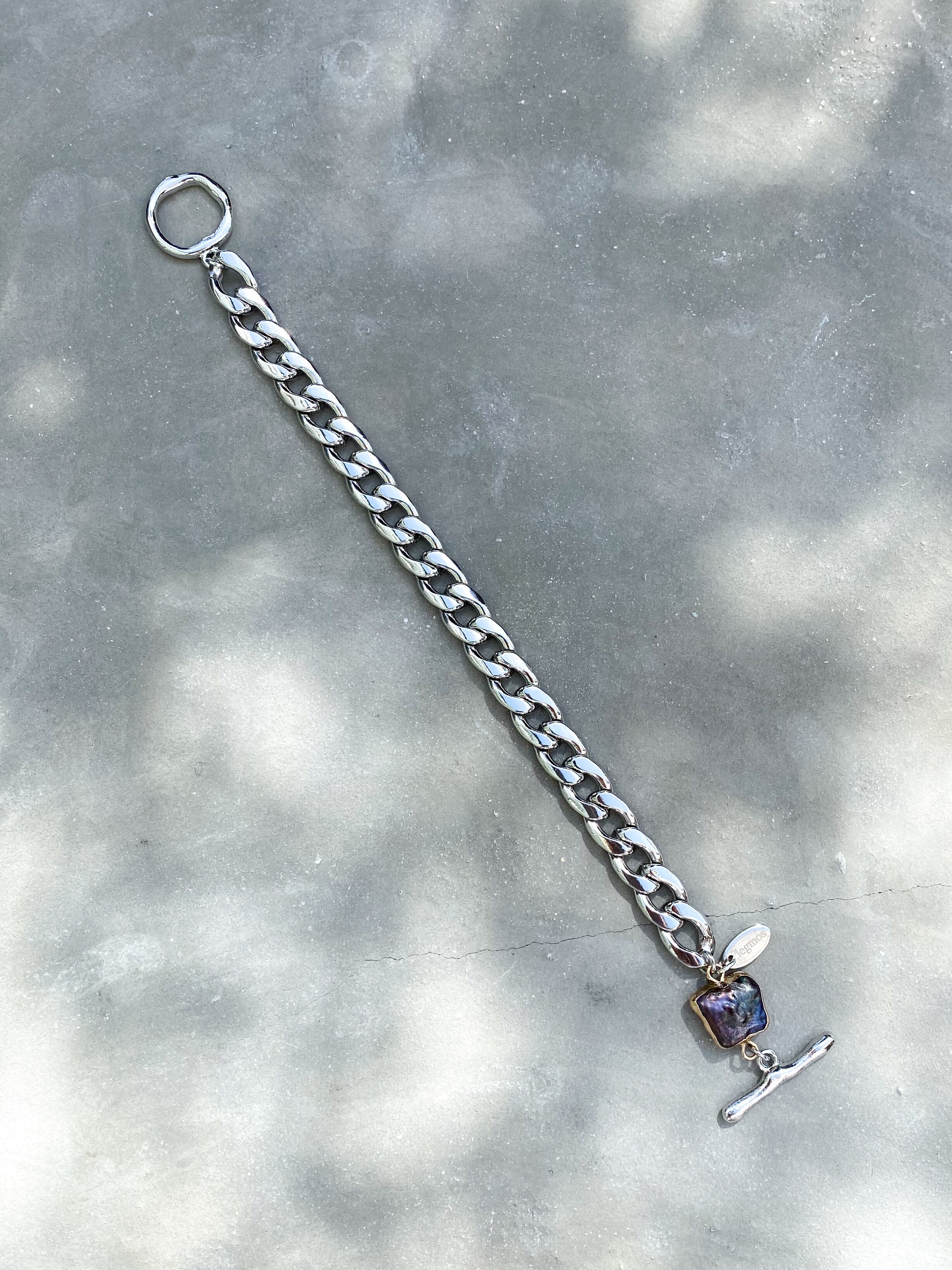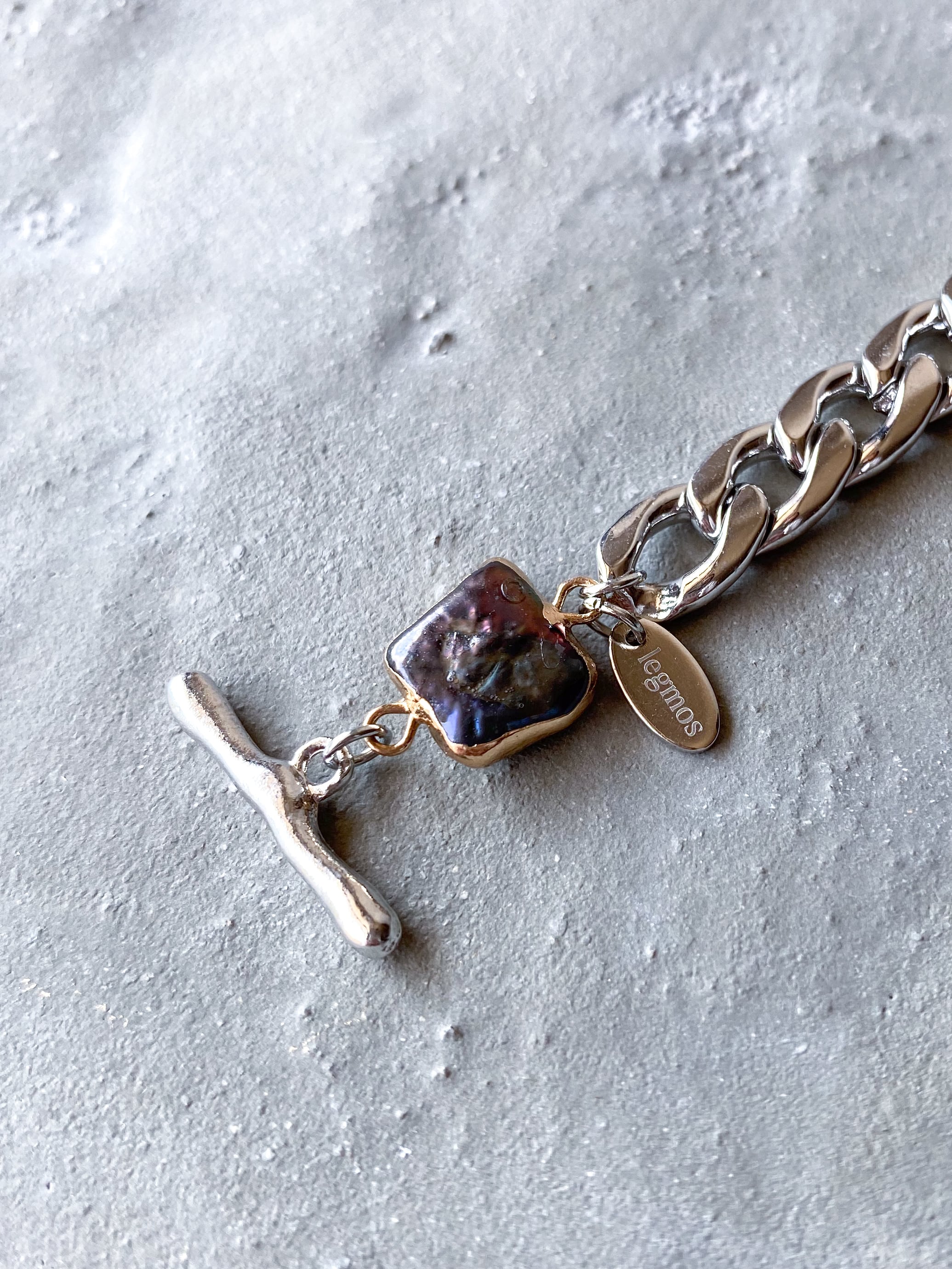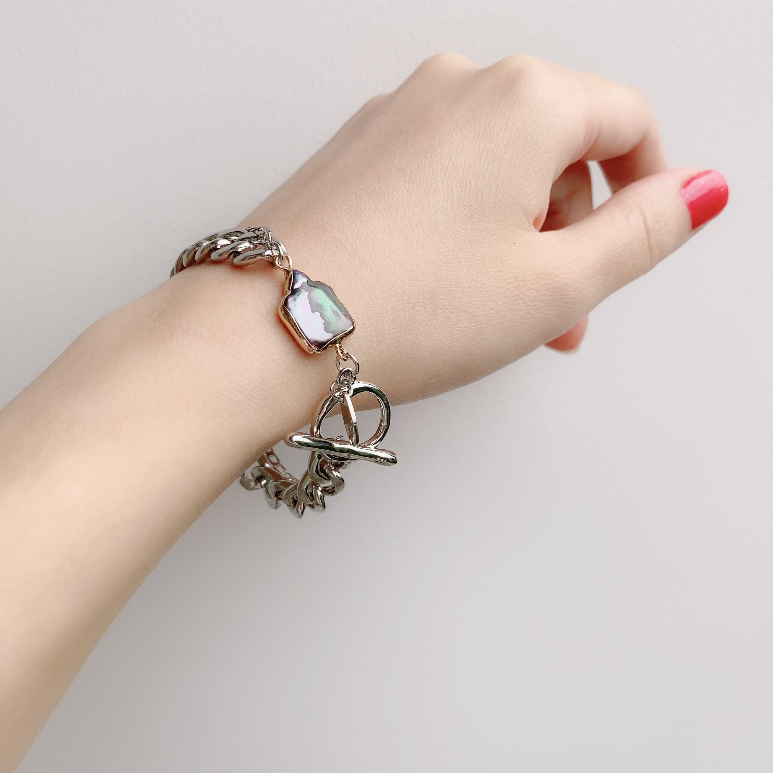 光の当たり方により色味が異なって見える天然淡水パールを合わせたシンプルモードなデザインに仕上げました。