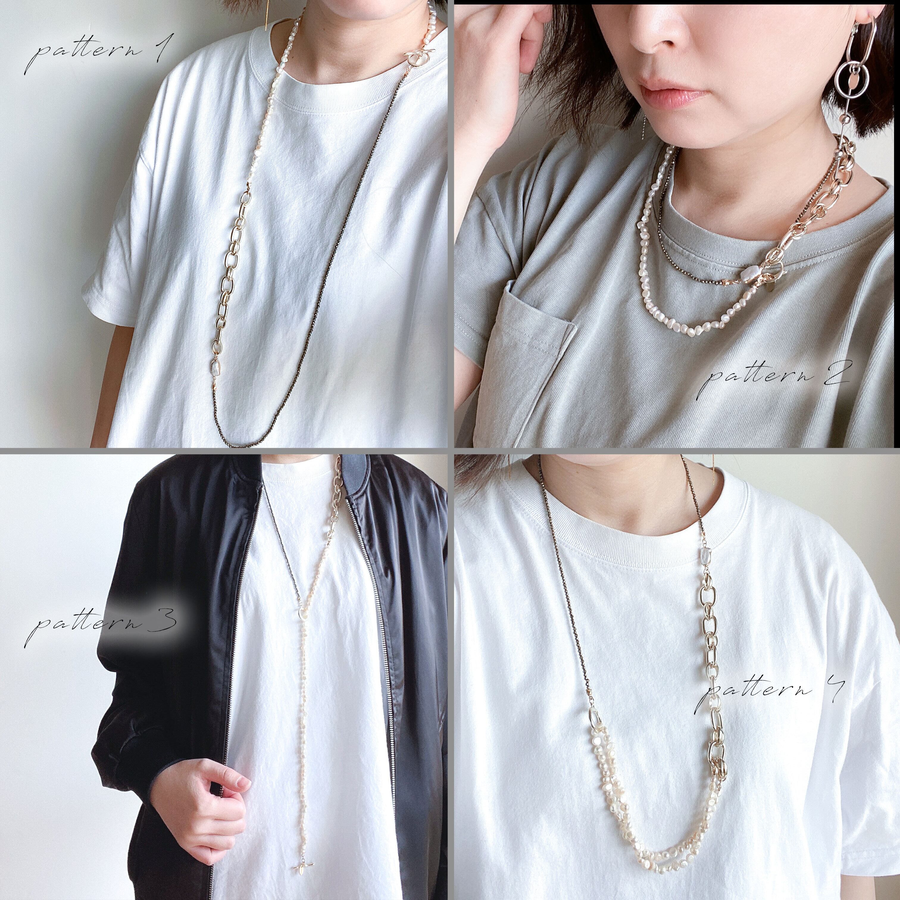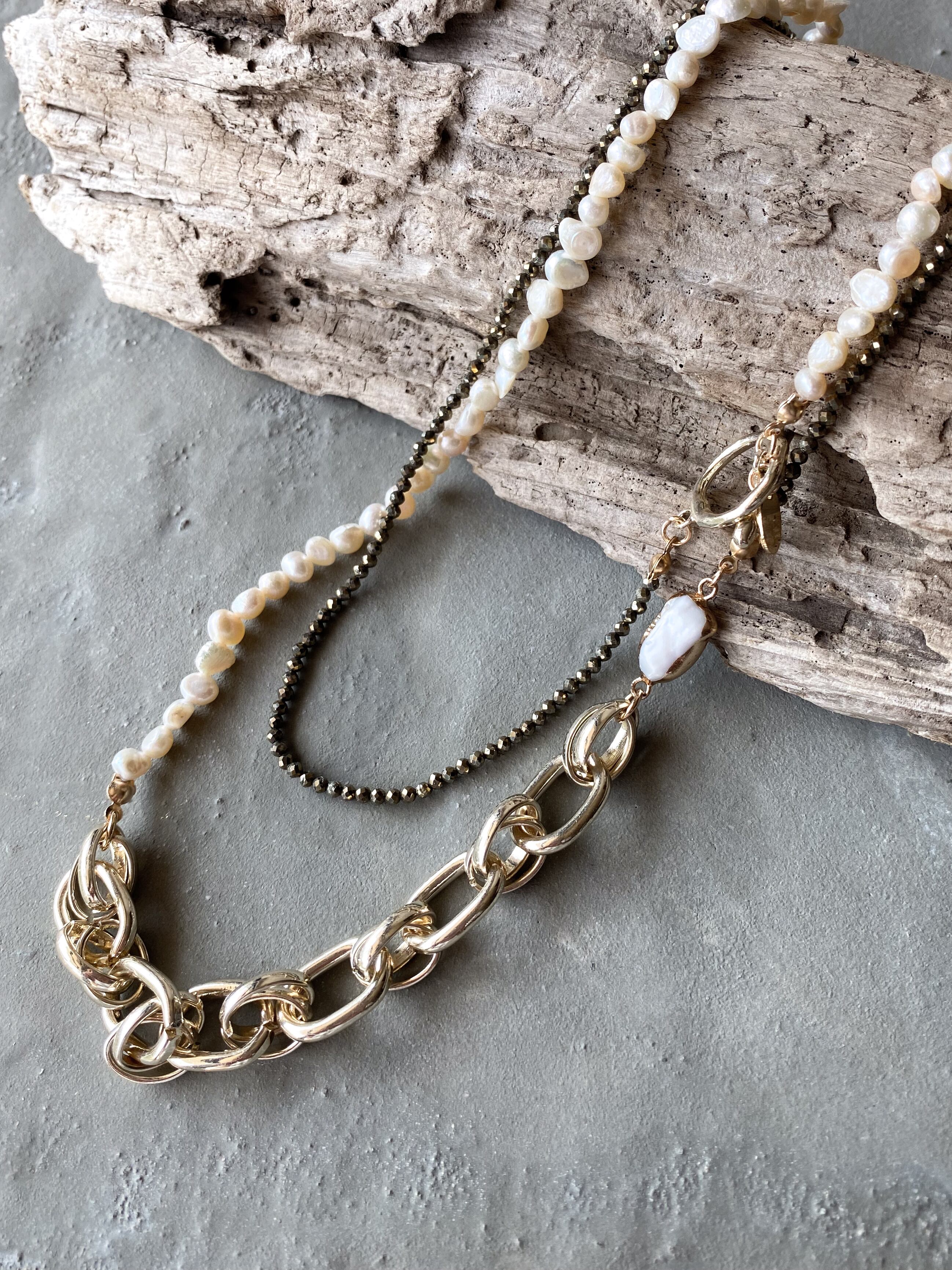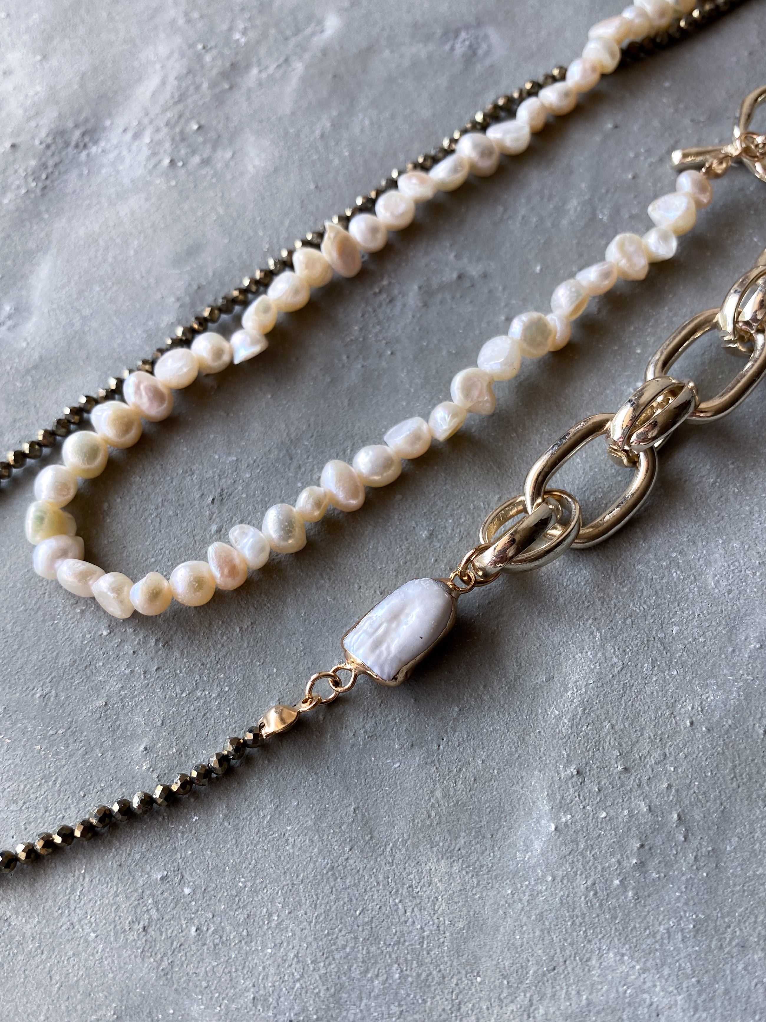 パイライト/淡水パール/bigチェーンの3種類の異素材をMIXさせたネックレスです。