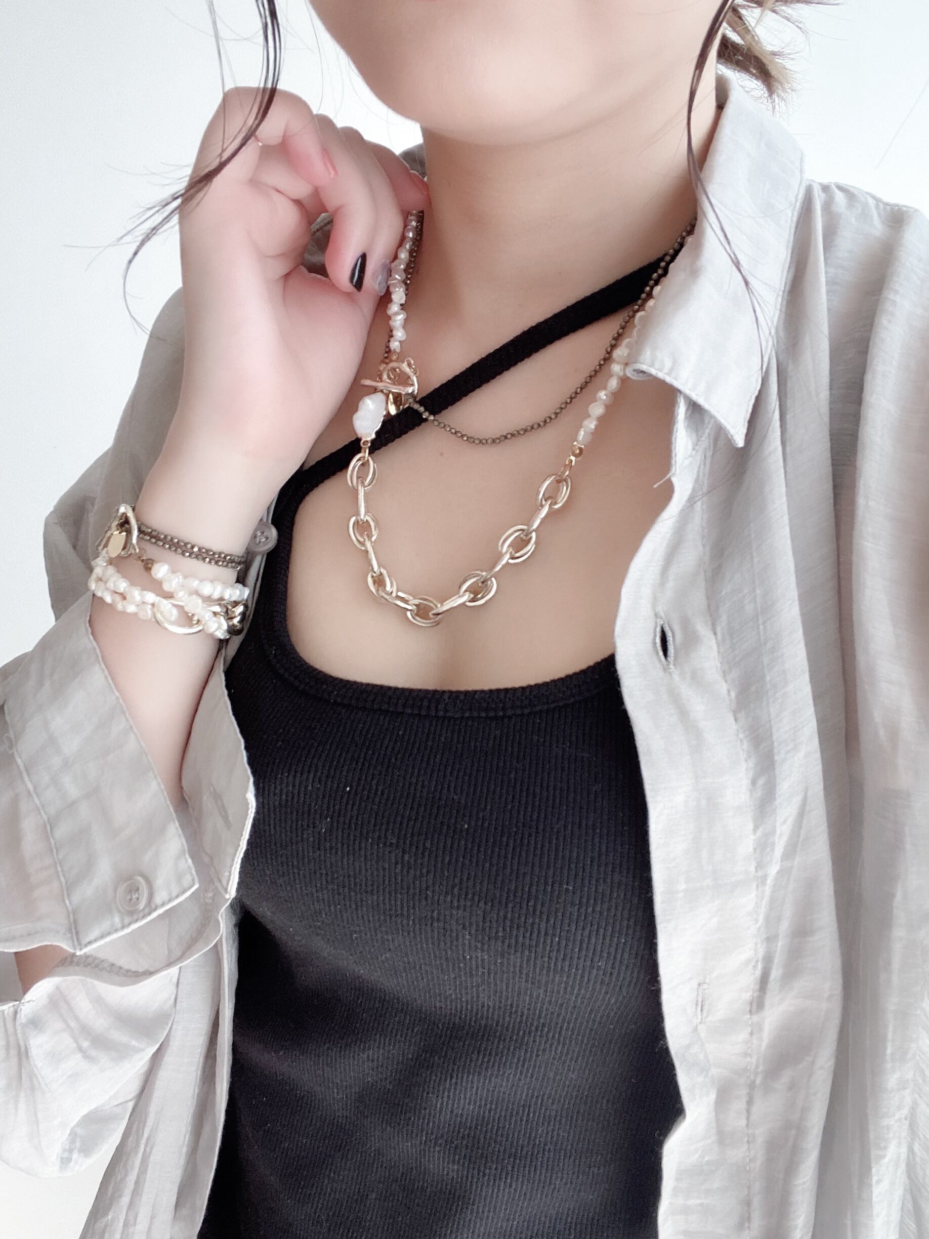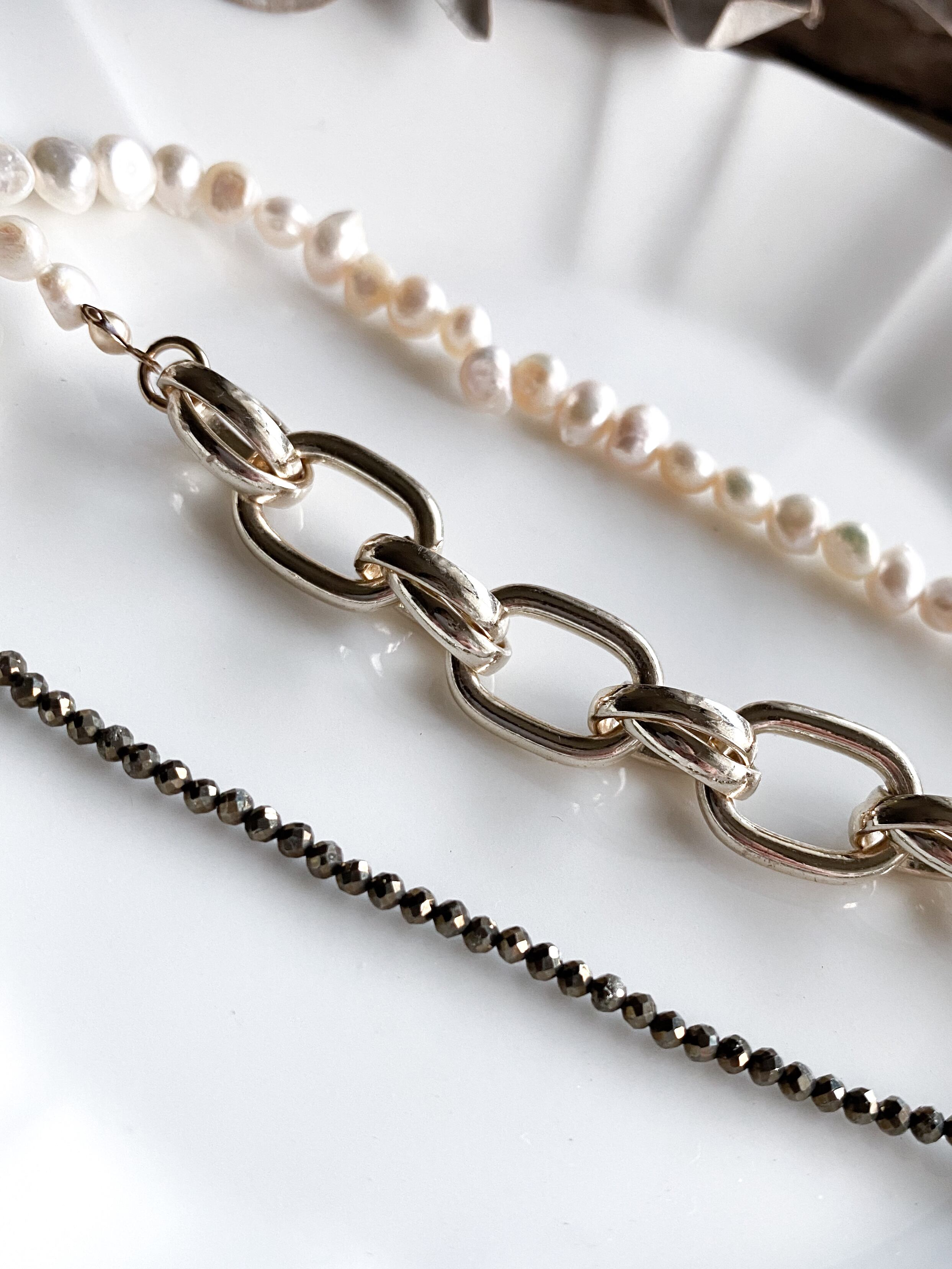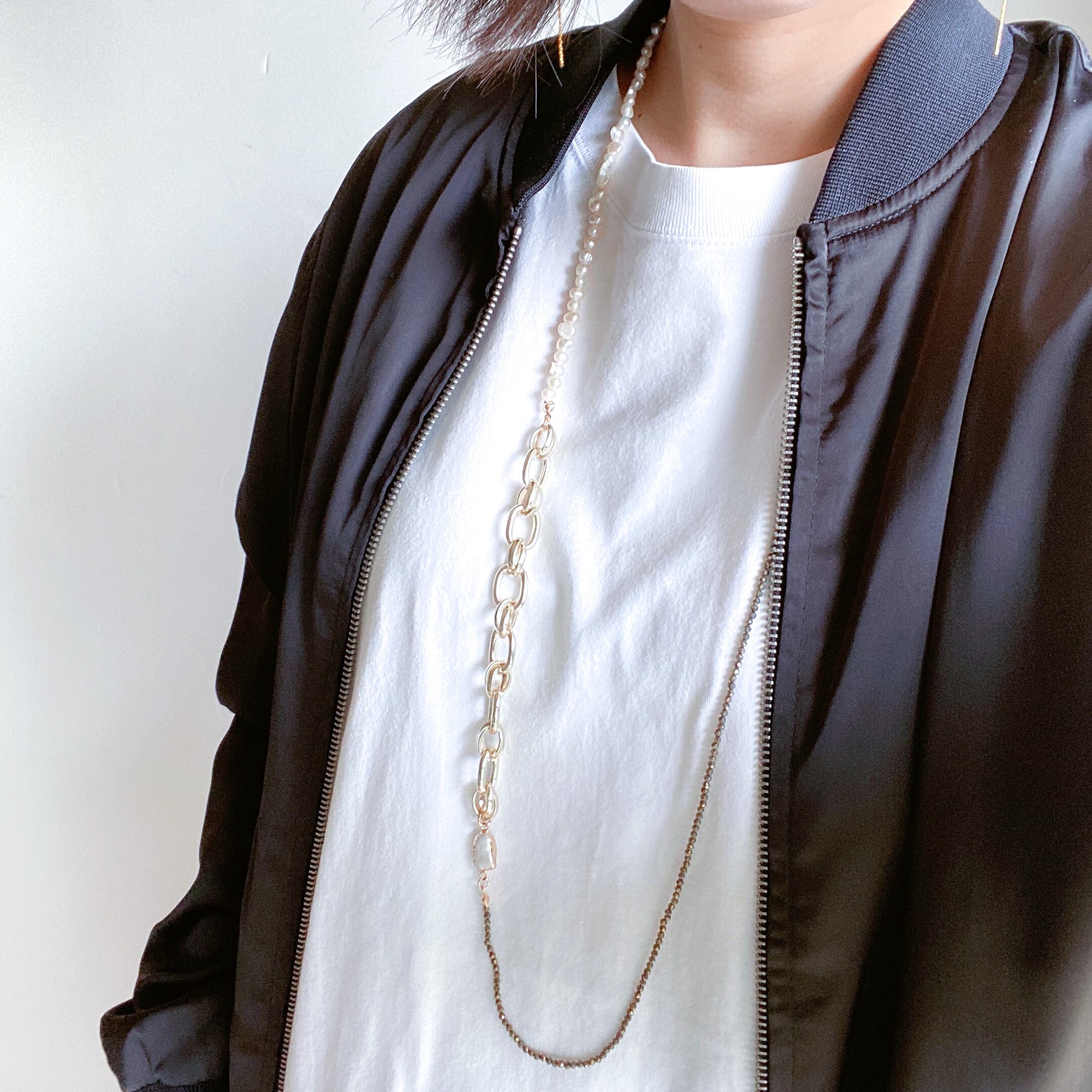 パイライト/淡水パール/bigチェーンの3種類の異素材をMIXさせたネックレスです。