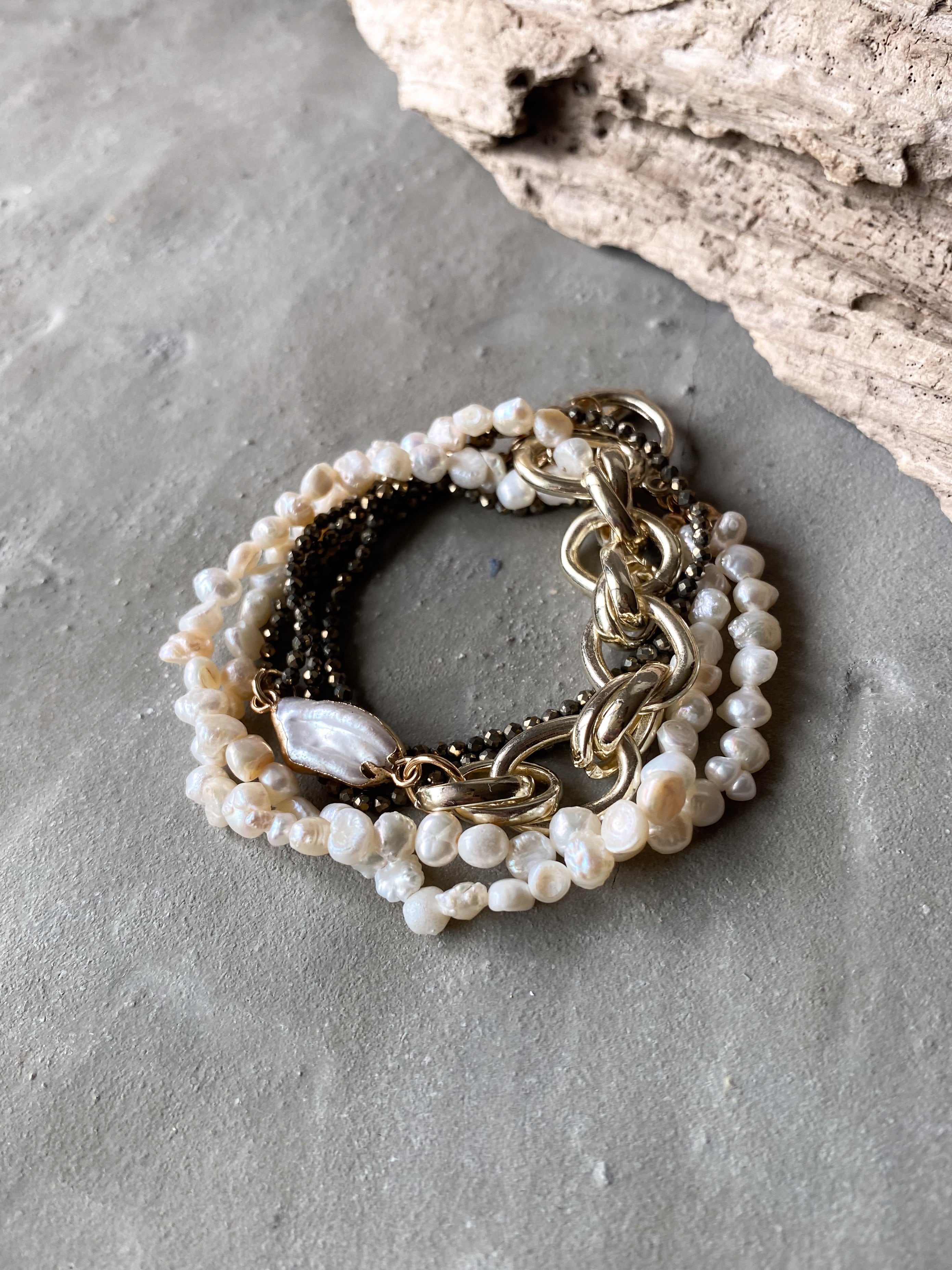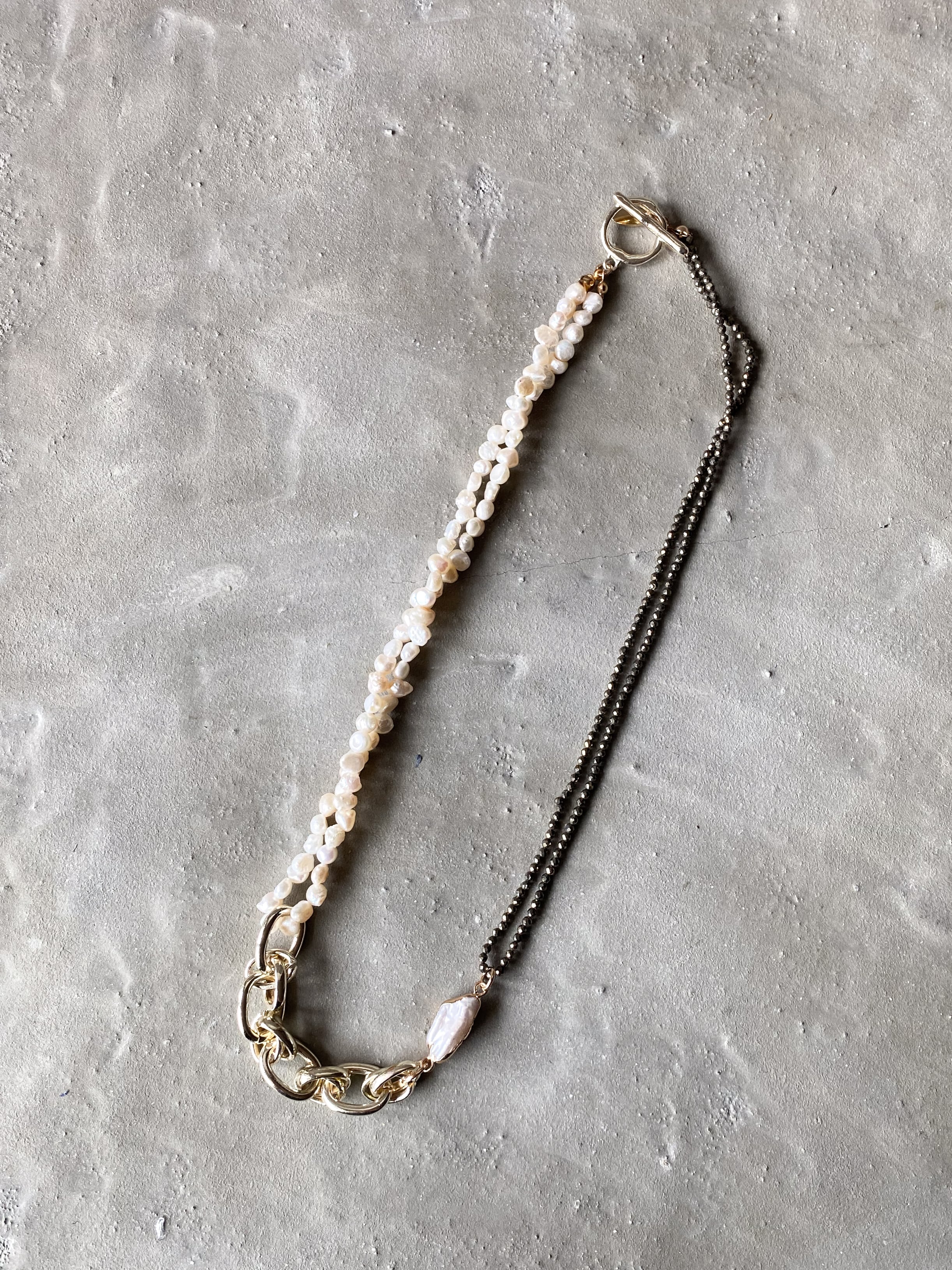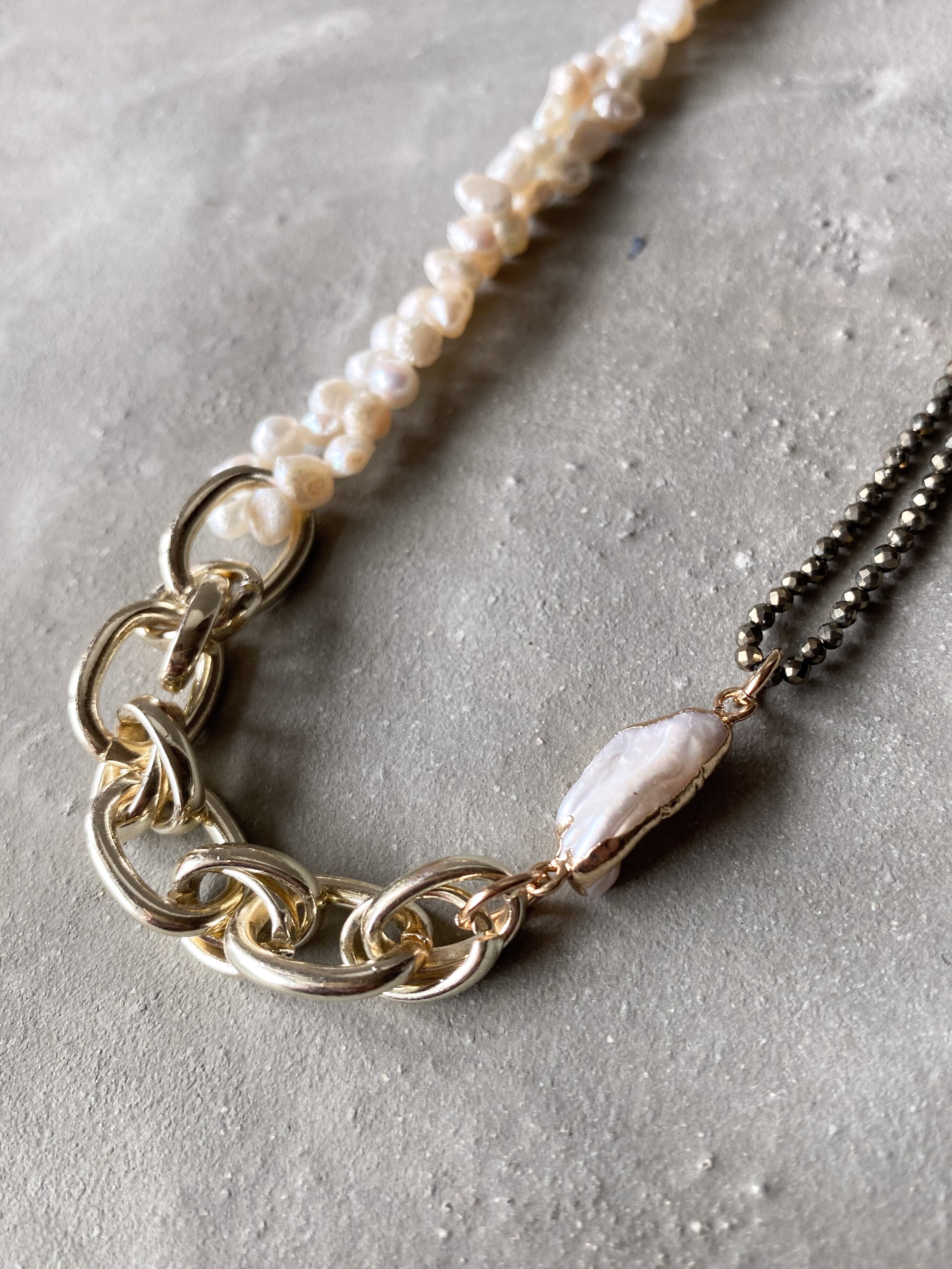 パイライト/淡水パール/bigチェーンの3種類の異素材をMIXさせたブレスレットです。