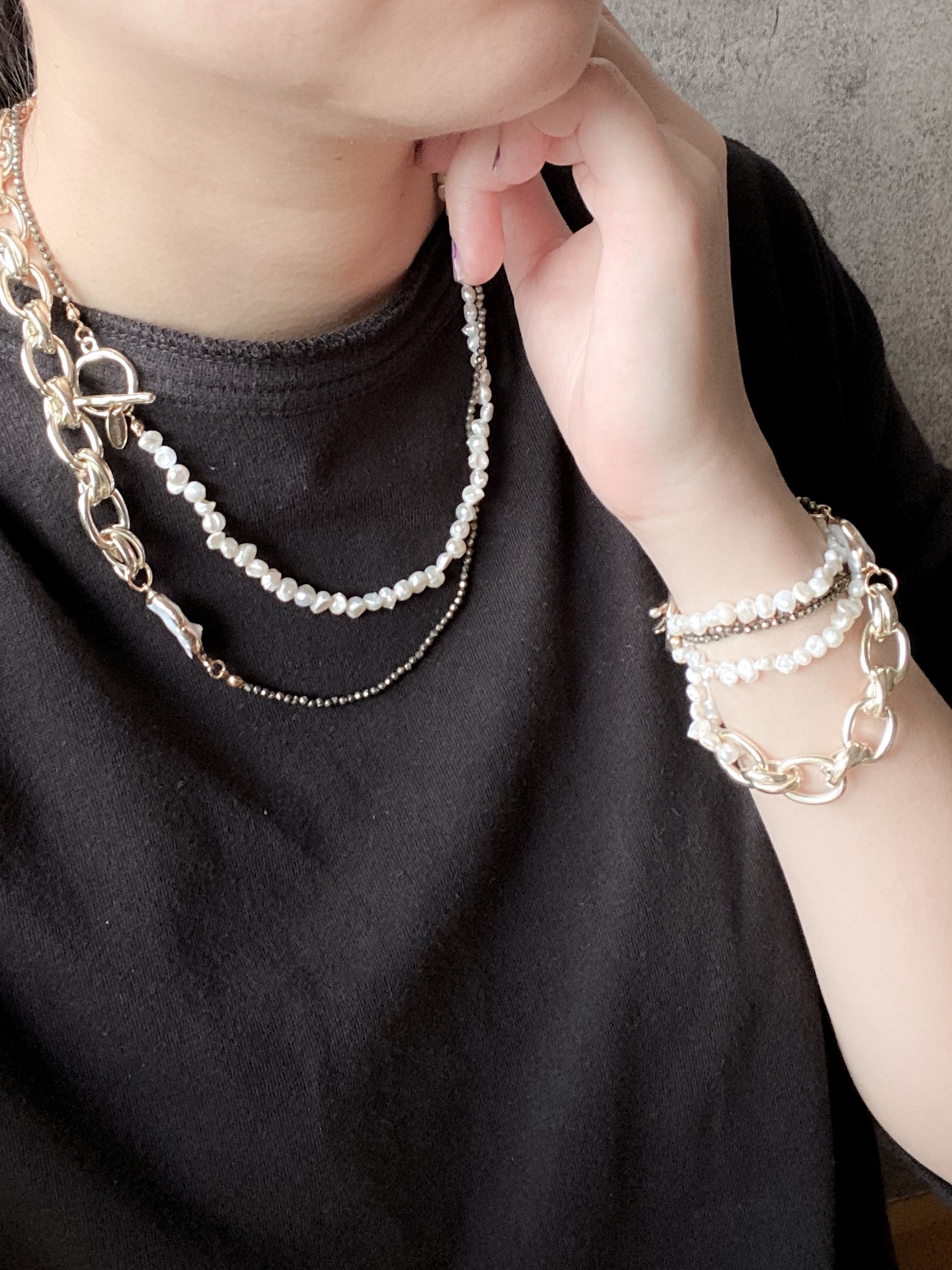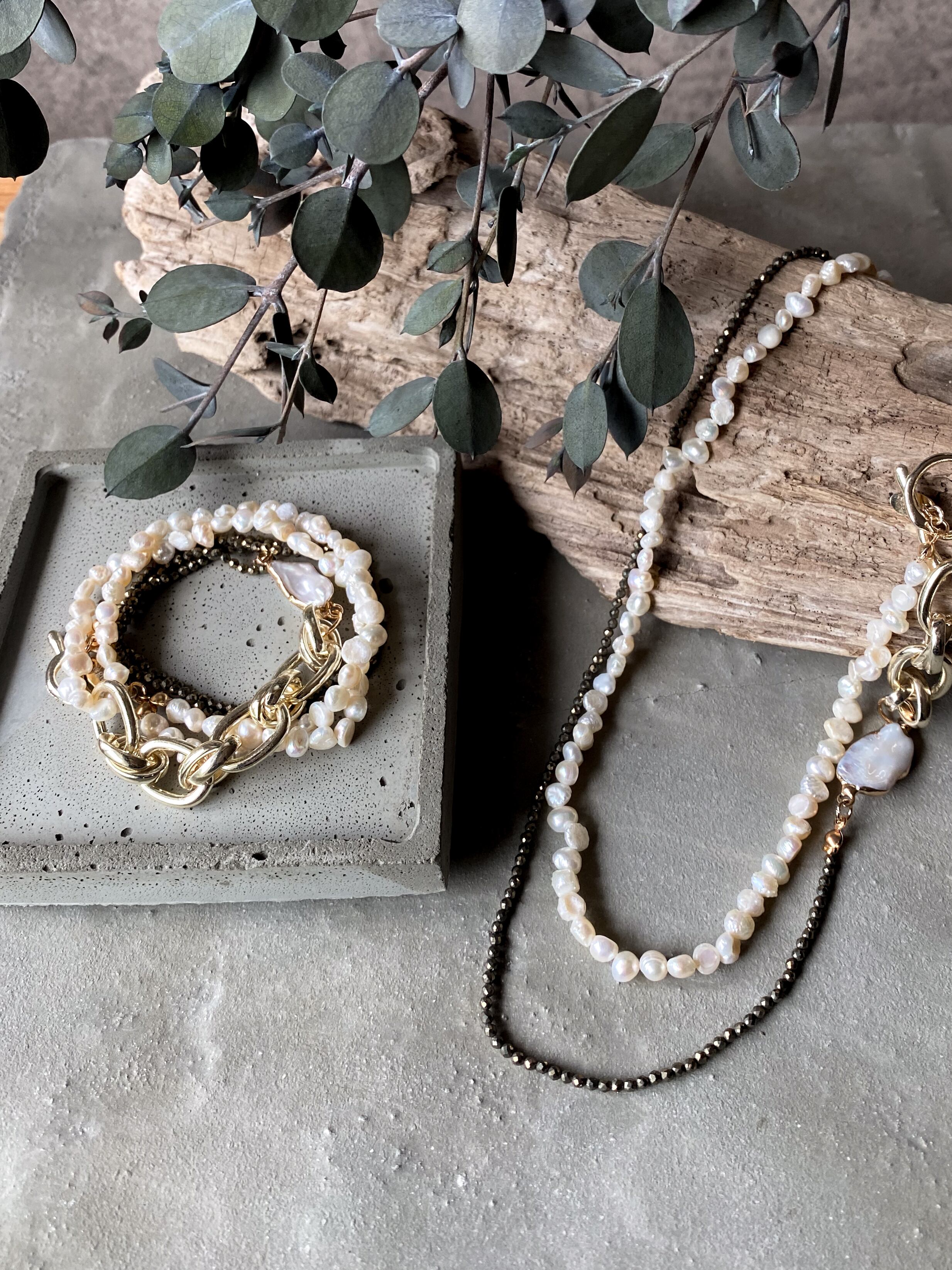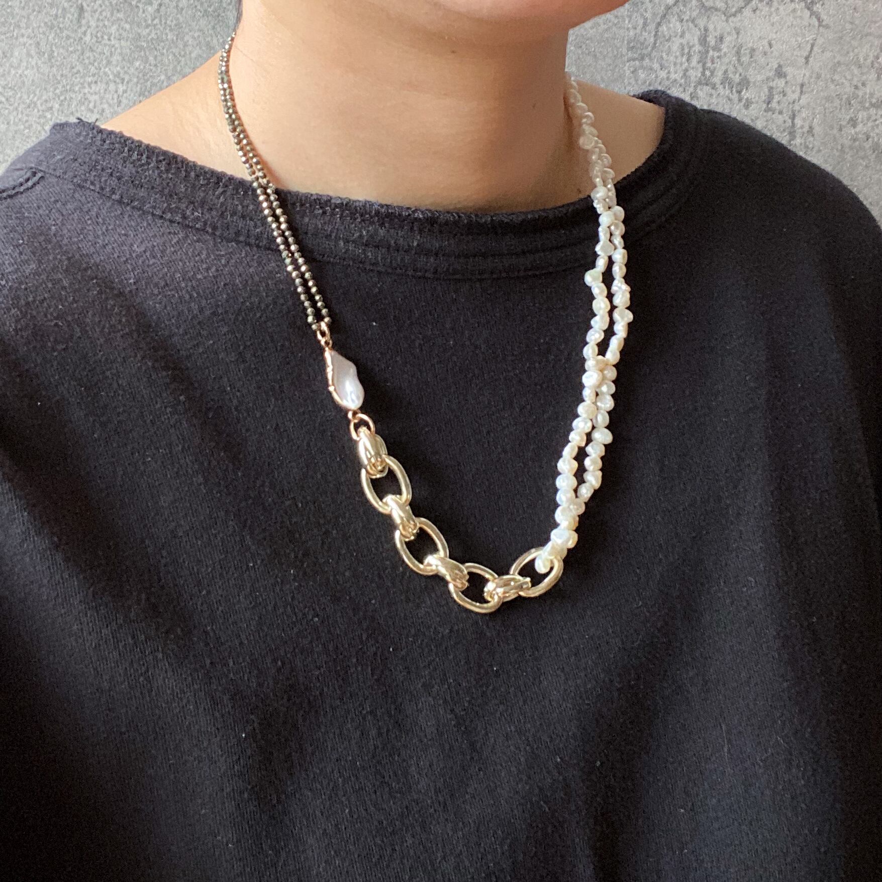 パイライト/淡水パール/bigチェーンの3種類の異素材をMIXさせたブレスレットです。