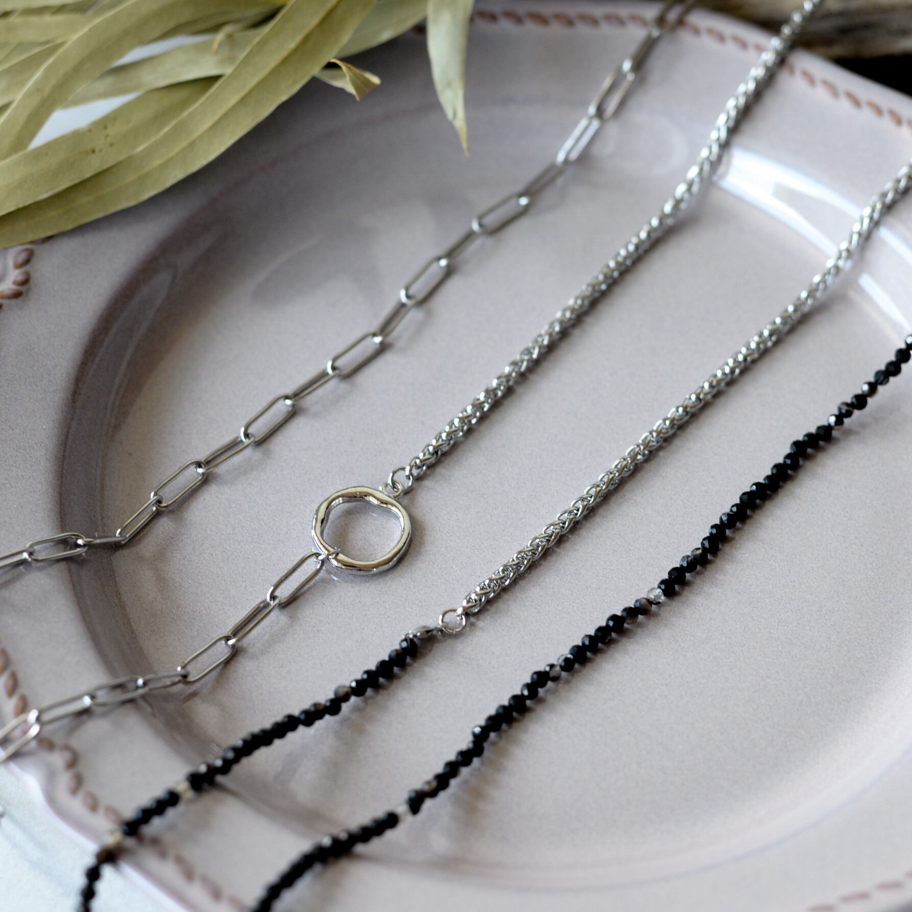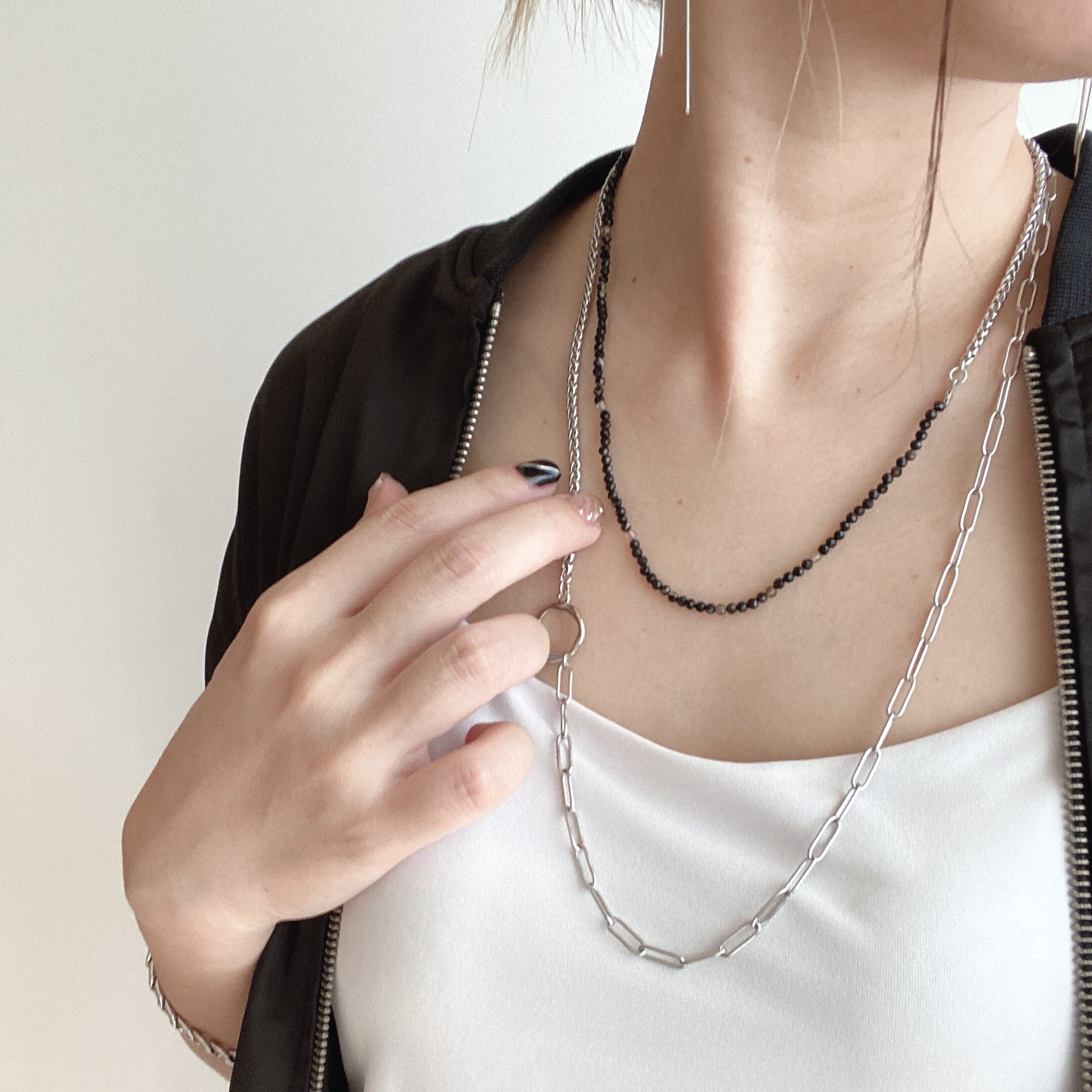 2連にしても、別々にしてもお使い頂けるステンレス素材のシルバーチェーンネックレス+ブラックオニキスネックレスの2SETです。