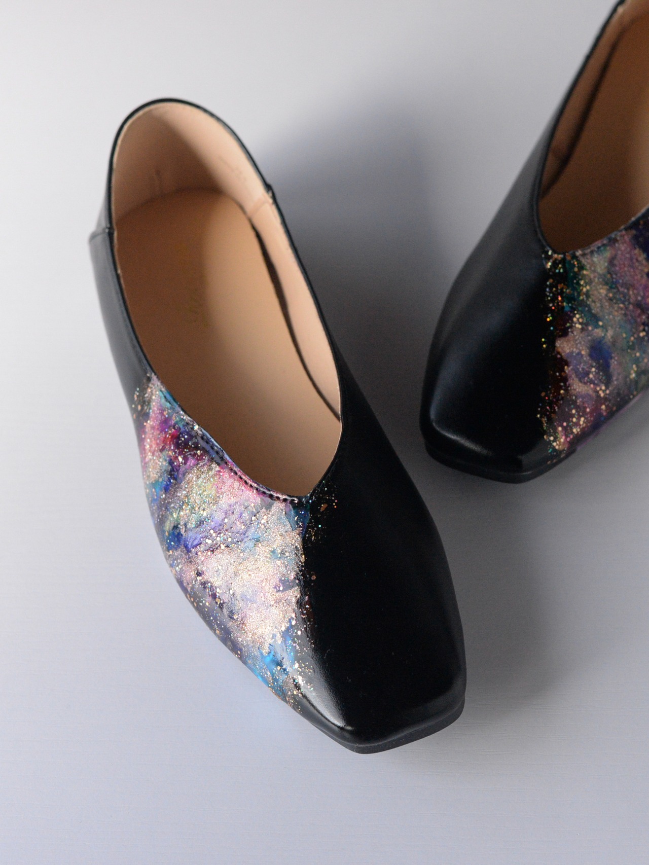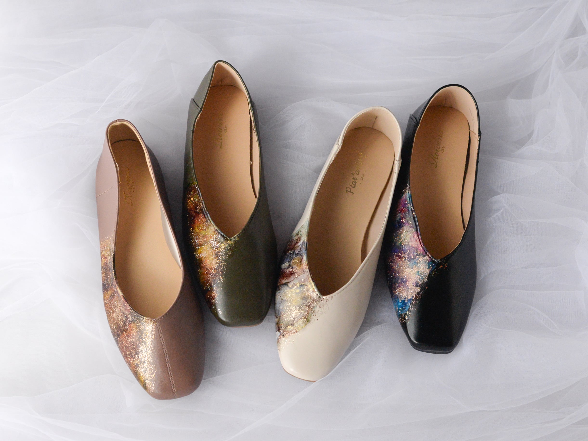ソフトで柔らかいレザーフラットパンプスにアルコールインクアートで天然石のようなニュアンスデザインを描き込みました。