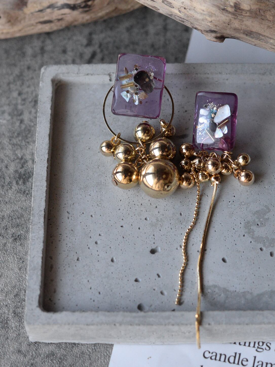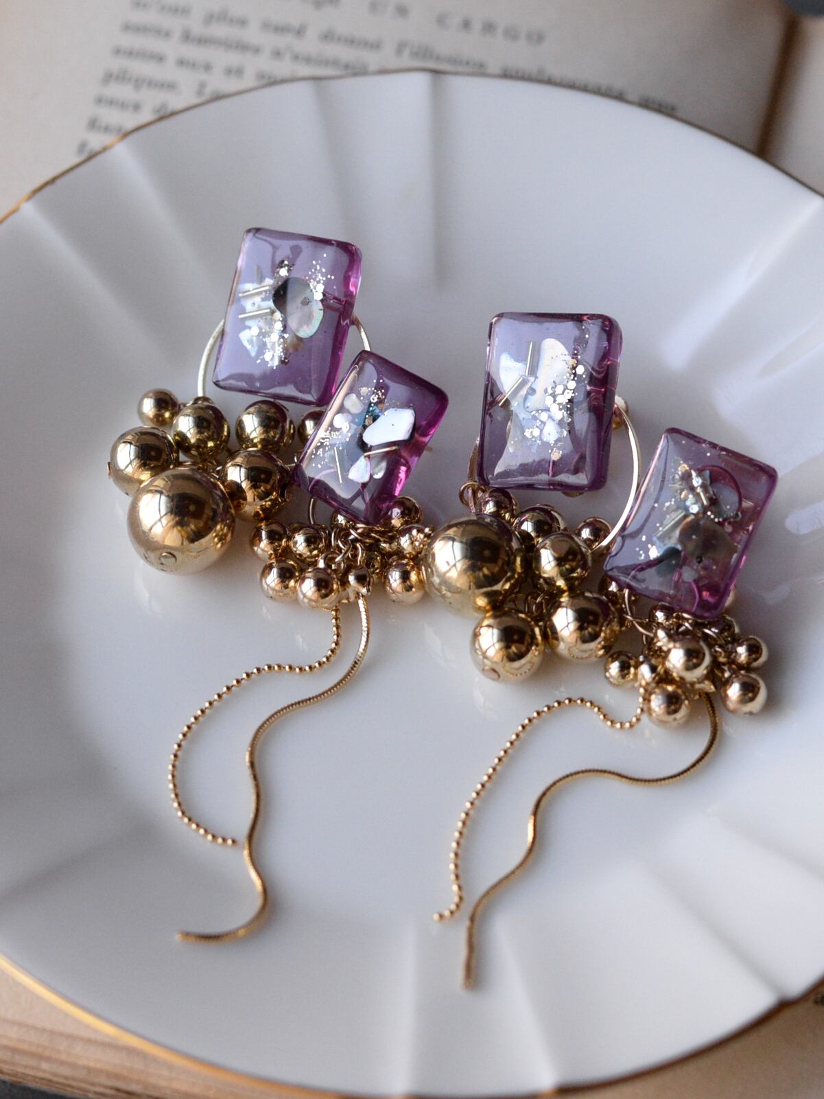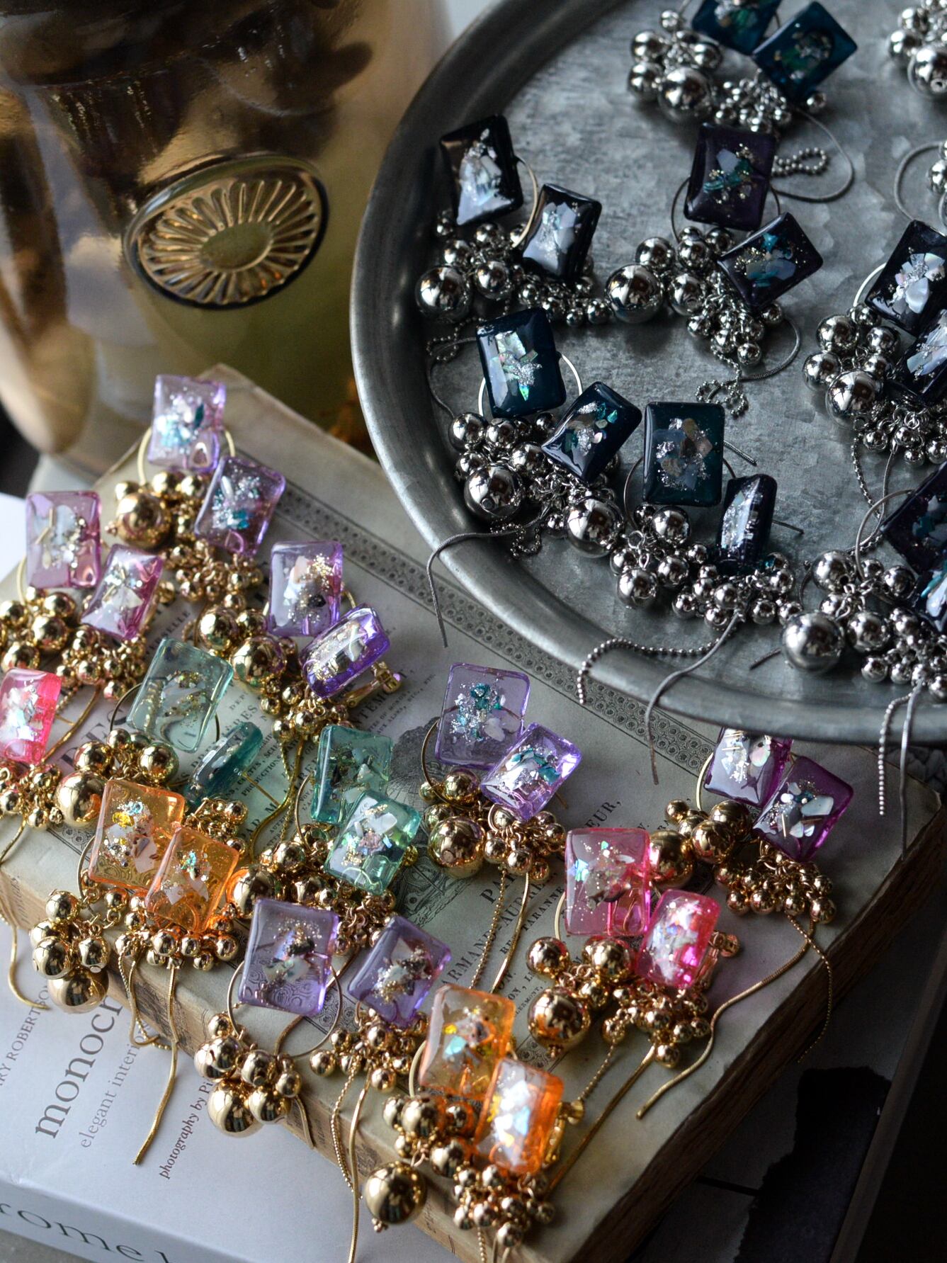 スケルトンカラーになったレジンパーツに天然石、シェル、ラメ等を封じたまるでキャンディのようなアクセサリー。