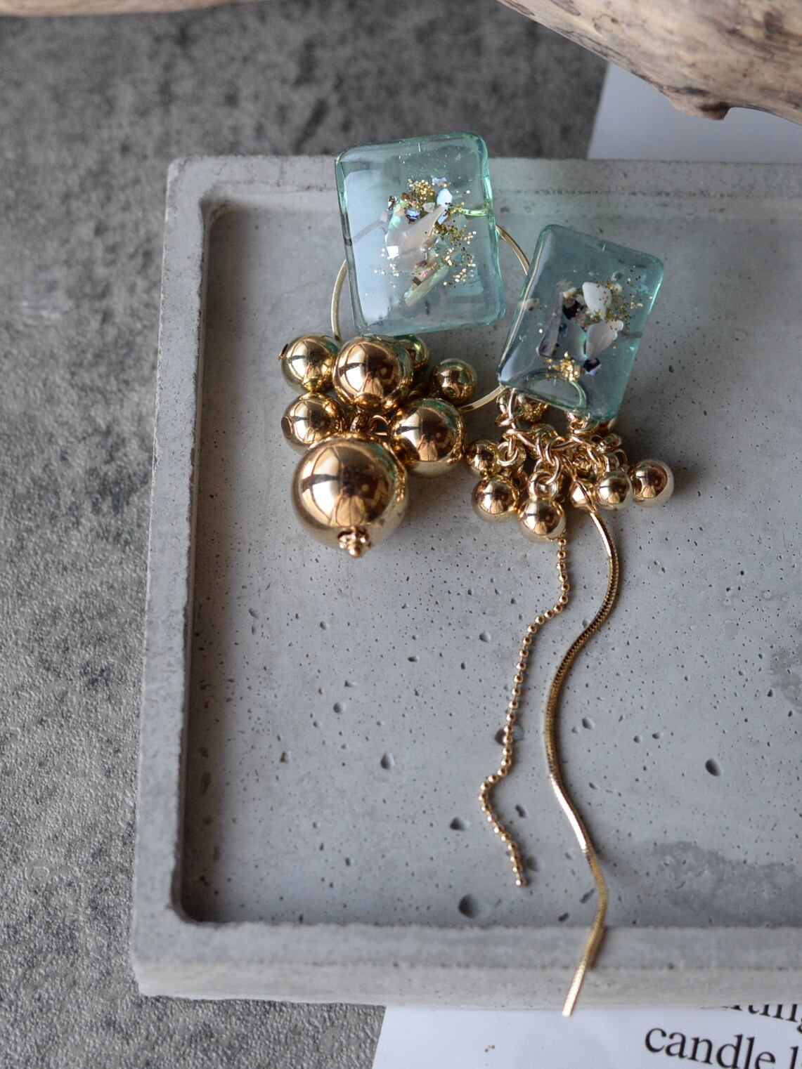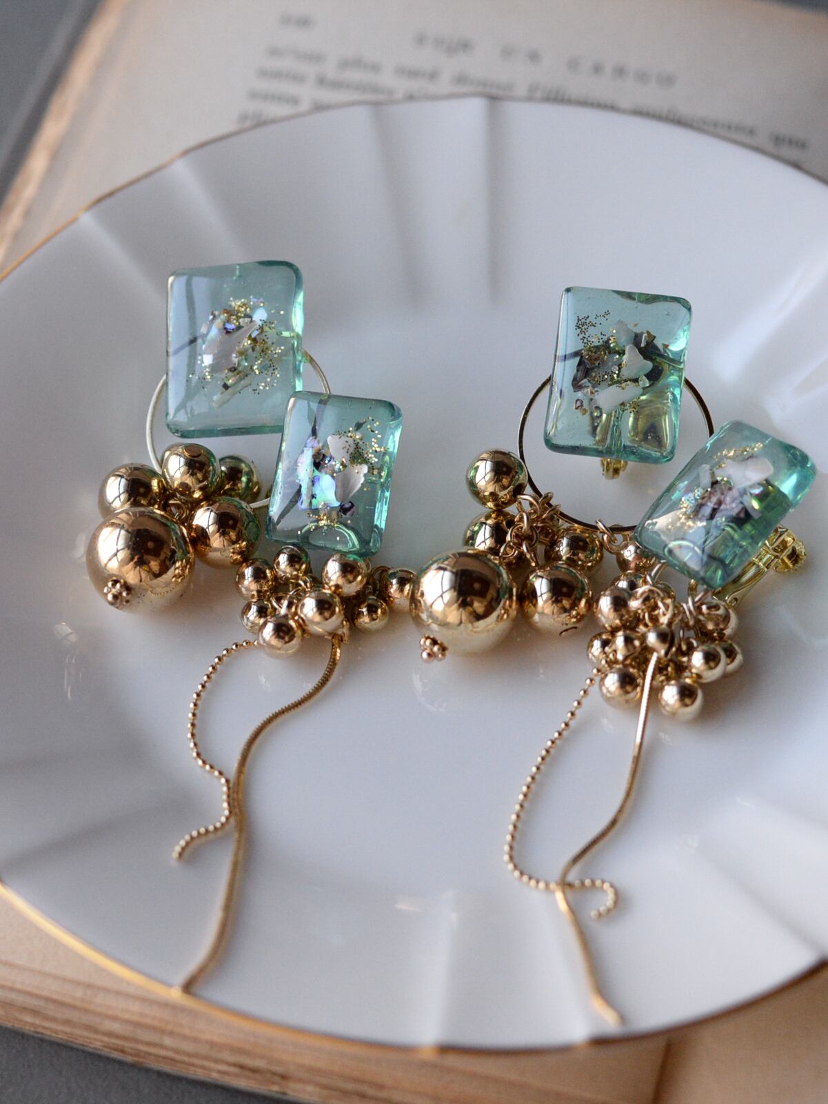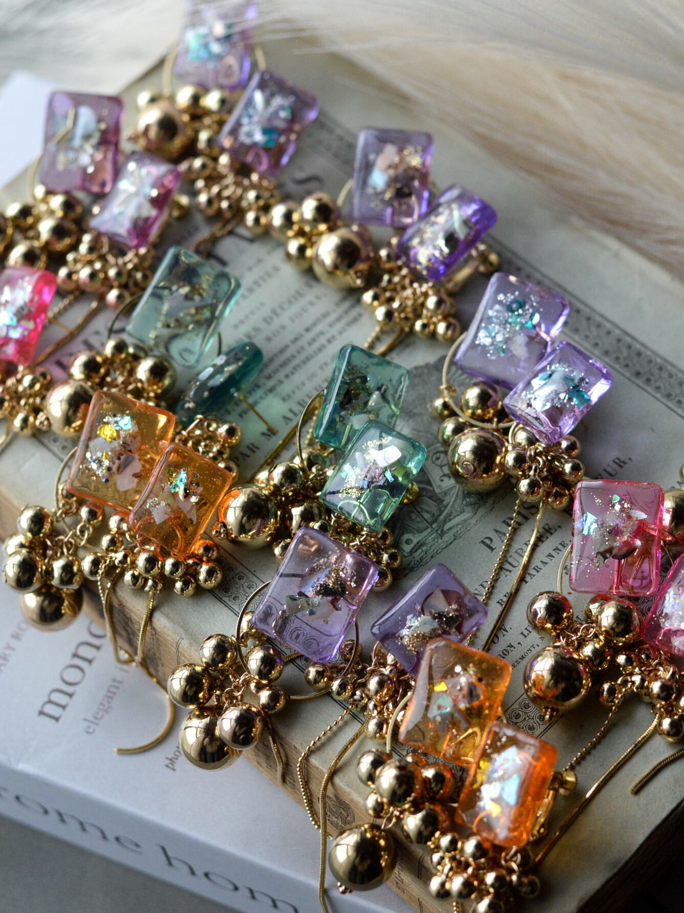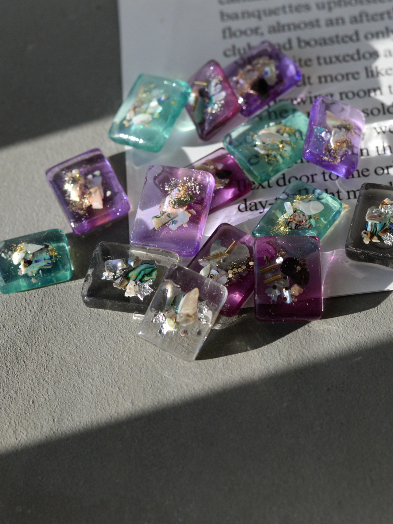 スケルトンカラーになったレジンパーツに天然石、シェル、ラメ等を封じたまるでキャンディのようなアクセサリー。