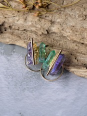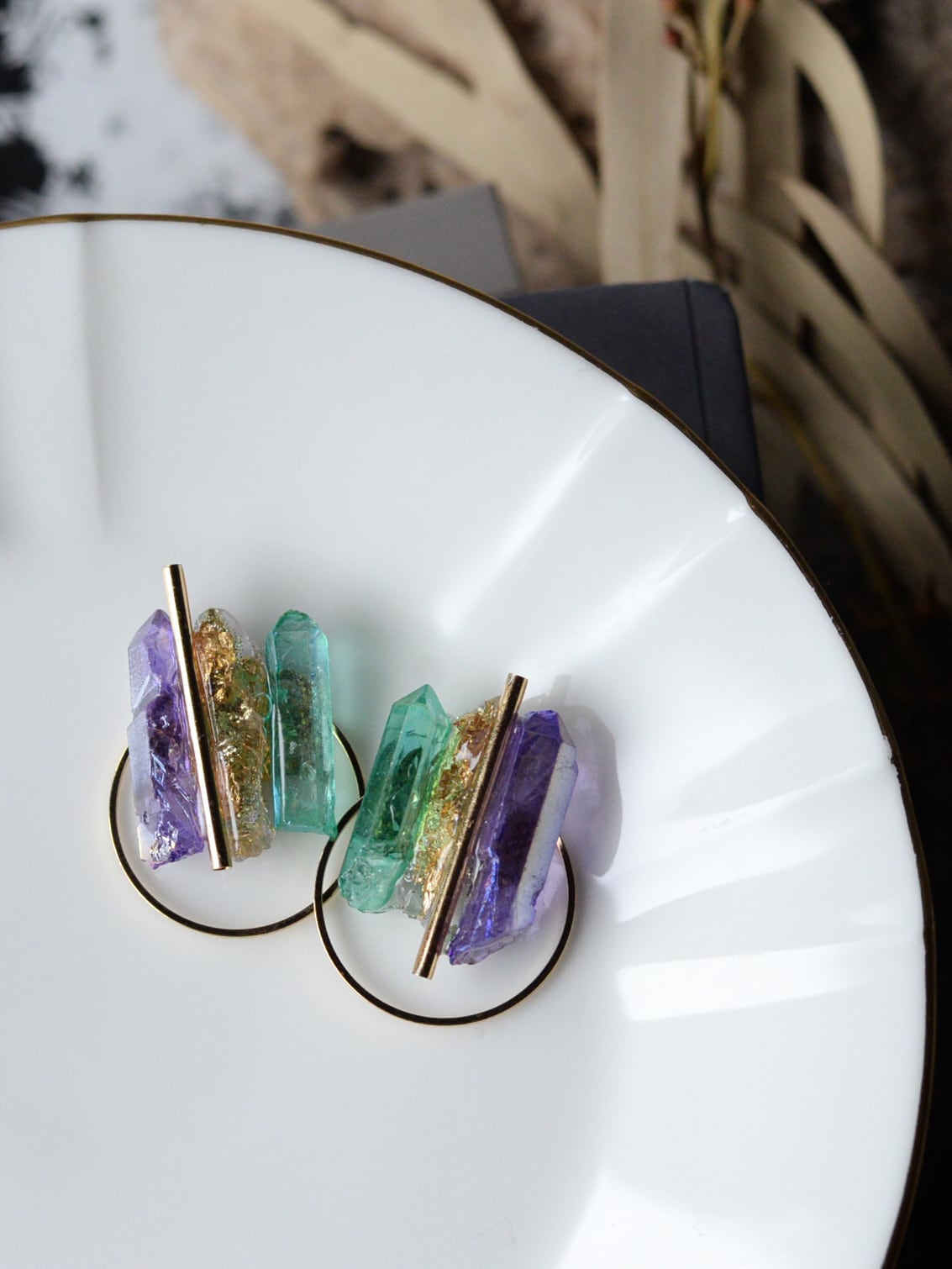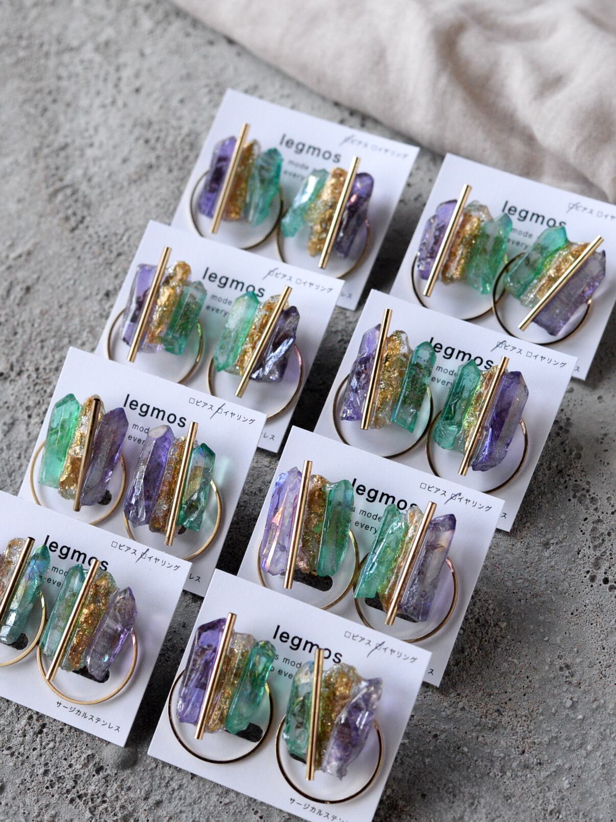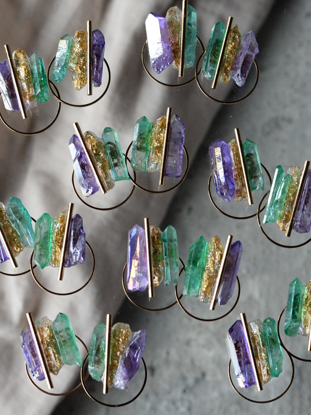 両サイドの天然石の間に、石をモールドで型取りラメやホロを封じたオリジナル樹脂パーツを組み合わせMIXさせています。