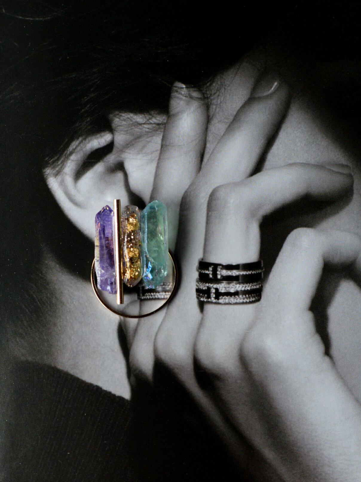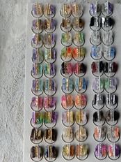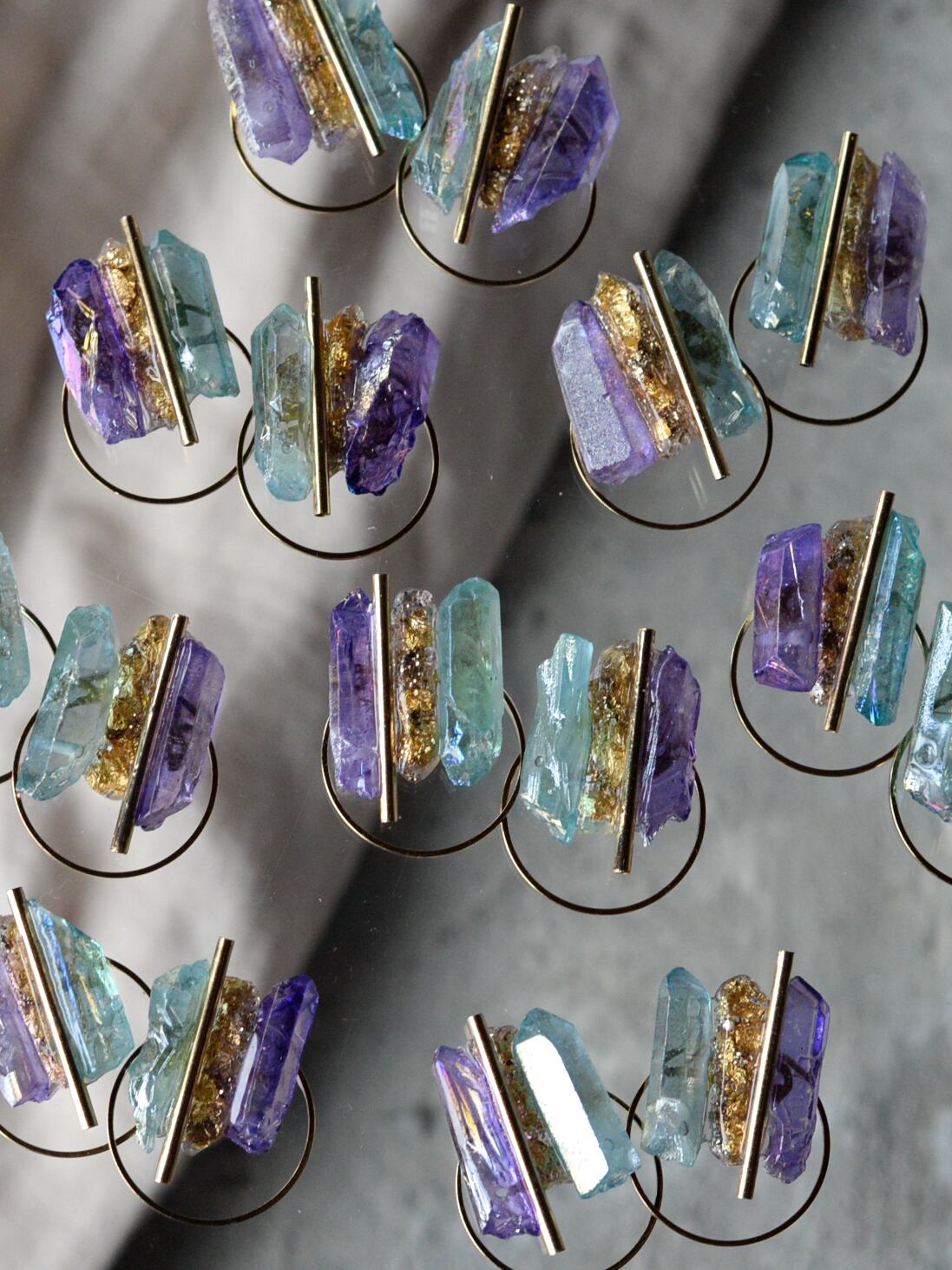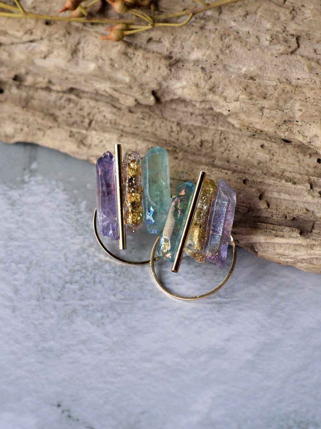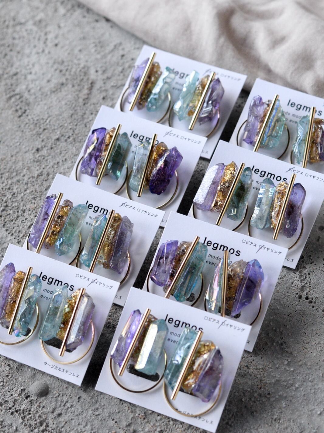 両サイドの天然石の間に、石をモールドで型取りラメやホロを封じたオリジナル樹脂パーツを組み合わせMIXさせています。