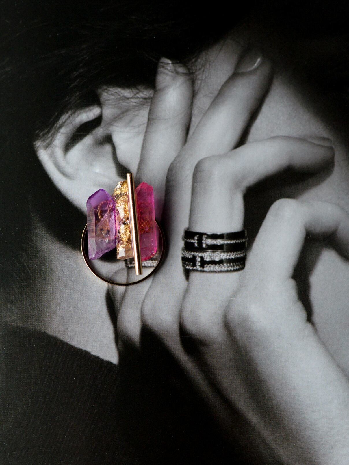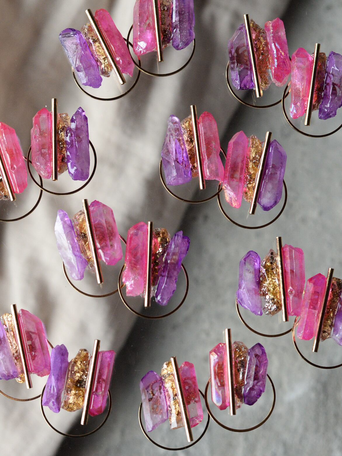 両サイドの天然石の間に、石をモールドで型取りラメやホロを封じたオリジナル樹脂パーツを組み合わせMIXさせています。