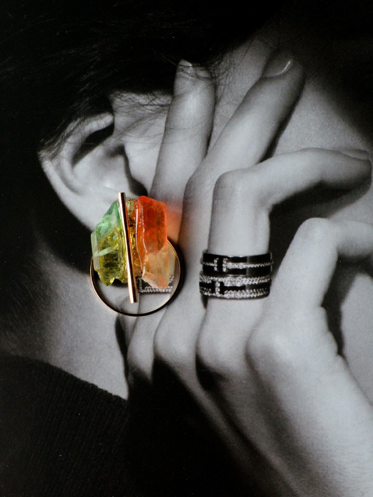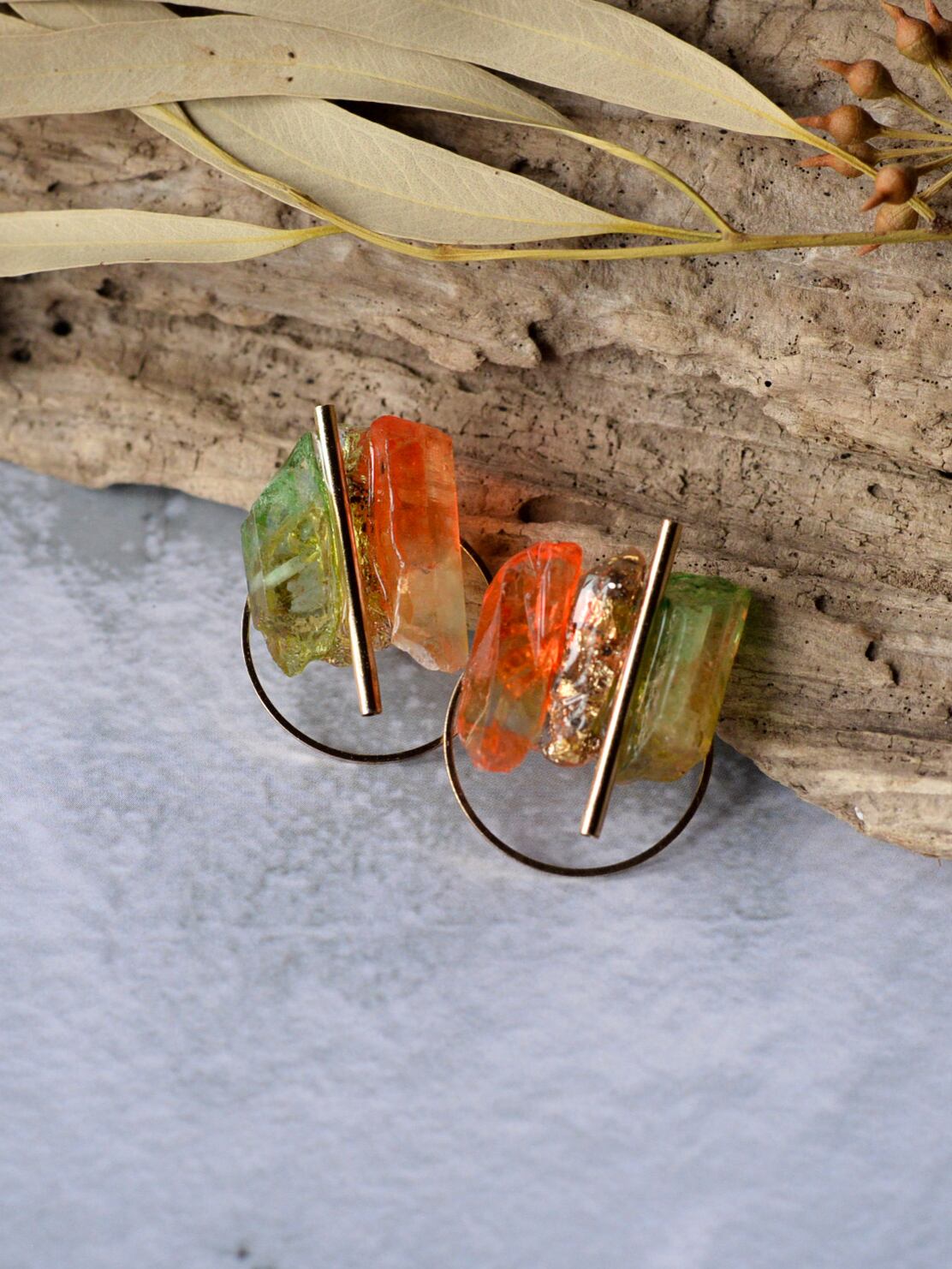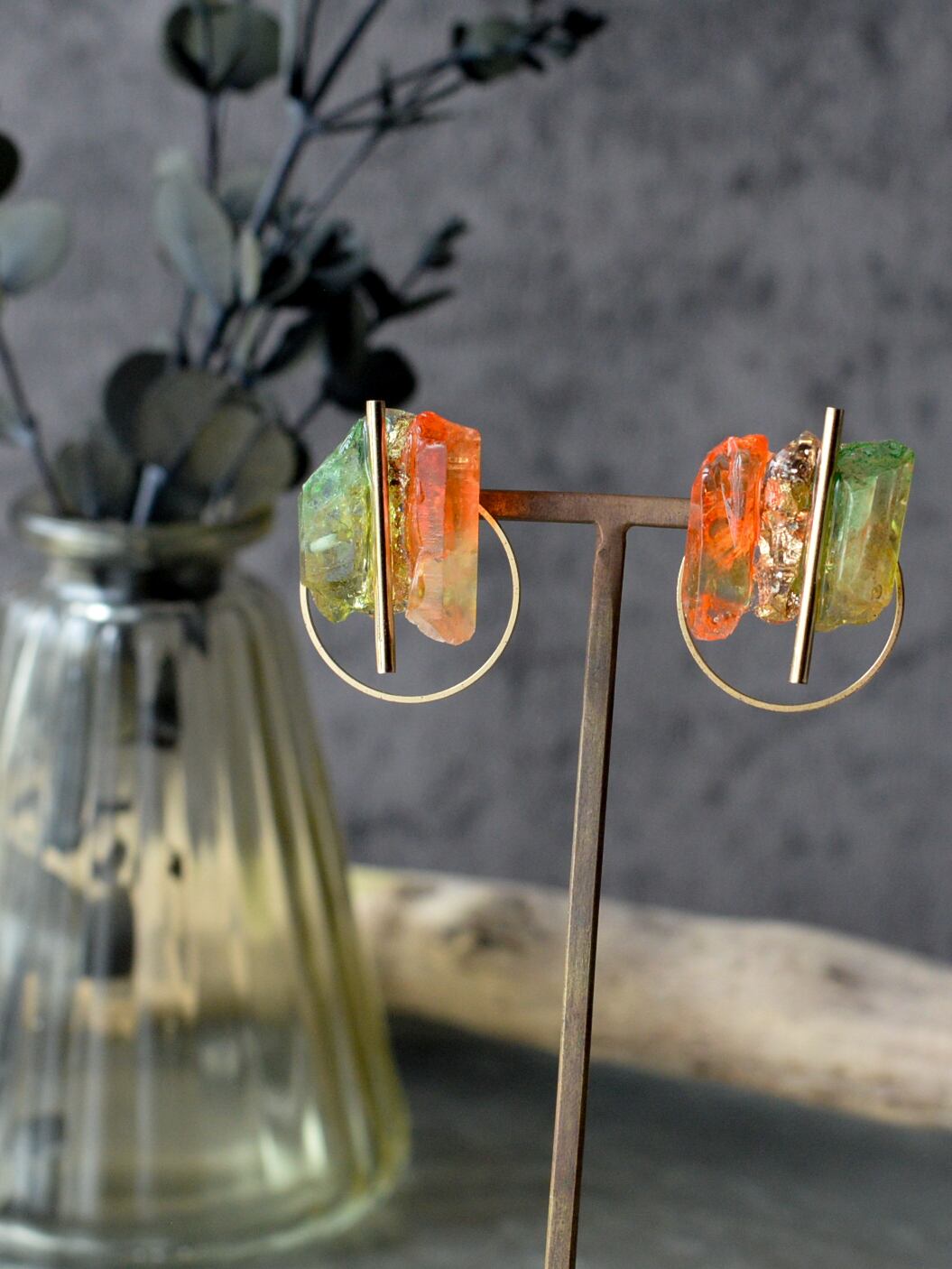 両サイドの天然石の間に、石をモールドで型取りラメやホロを封じたオリジナル樹脂パーツを組み合わせMIXさせています。
