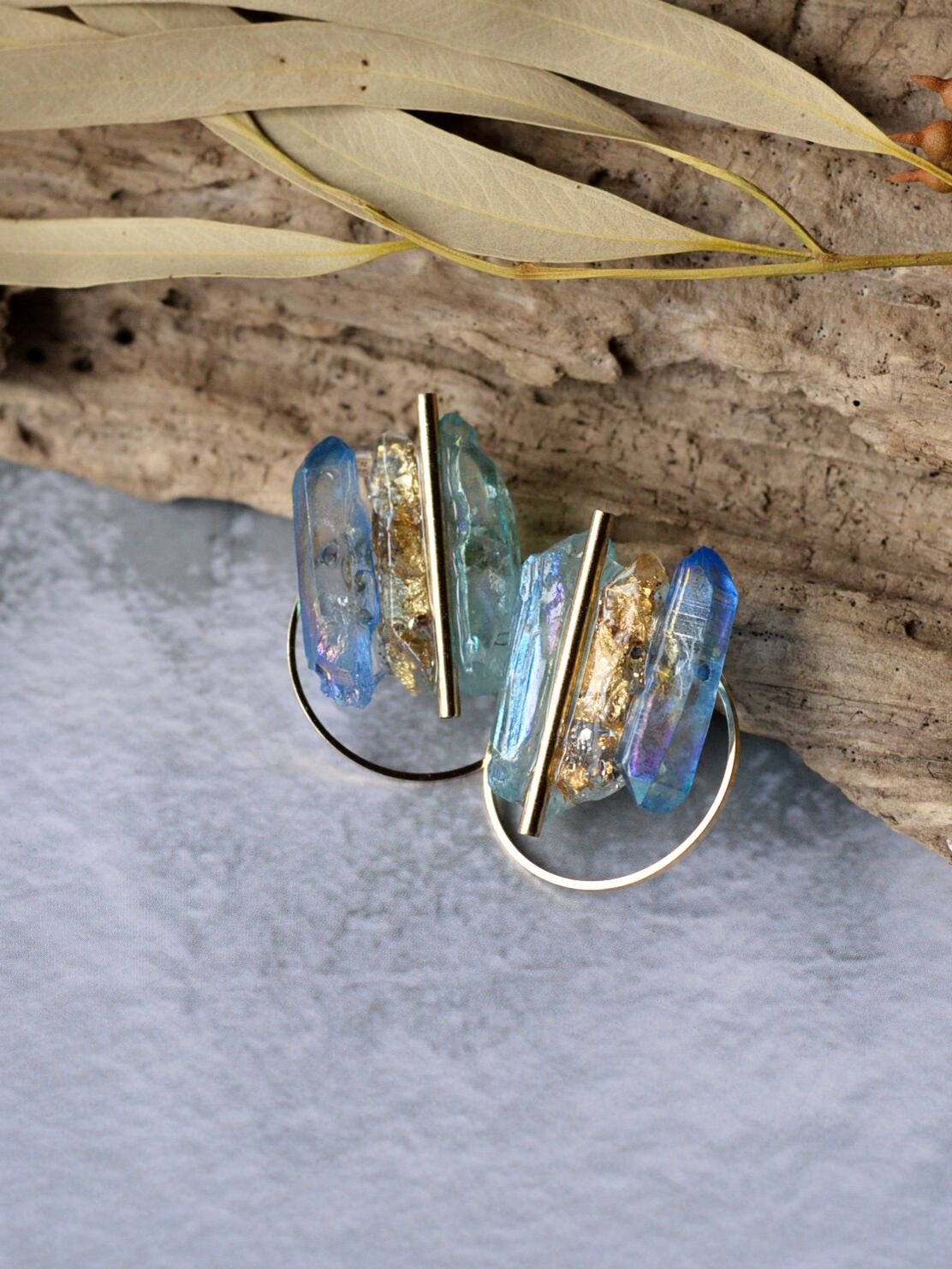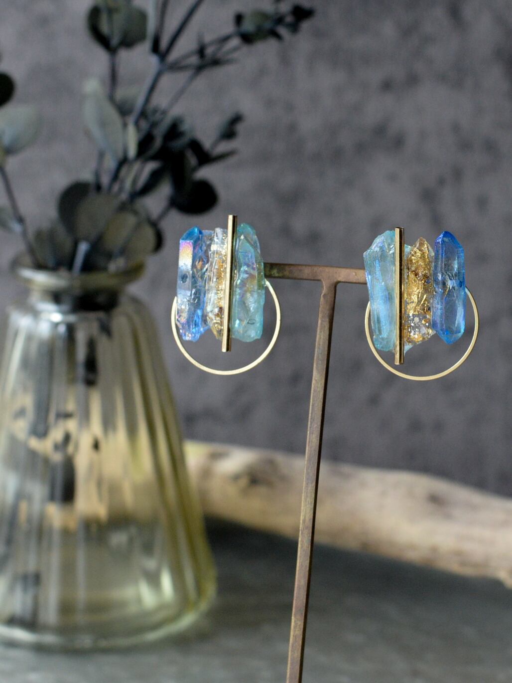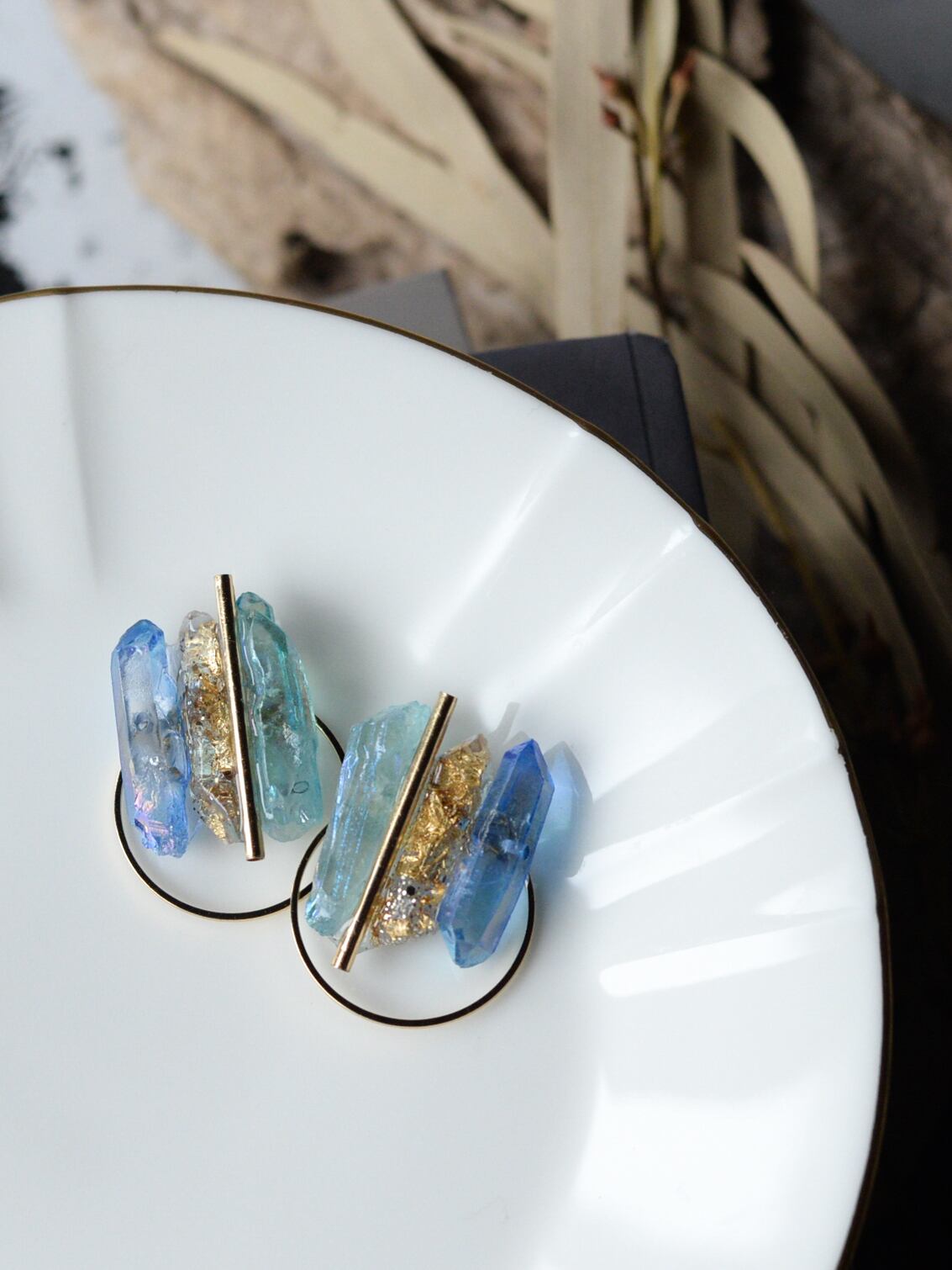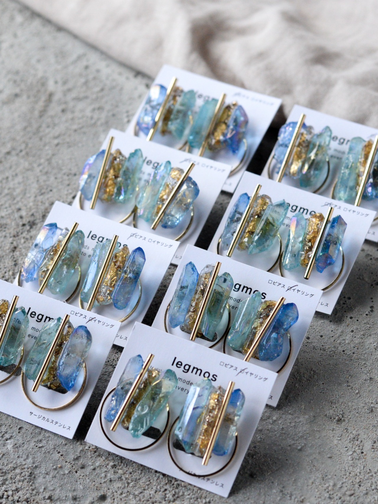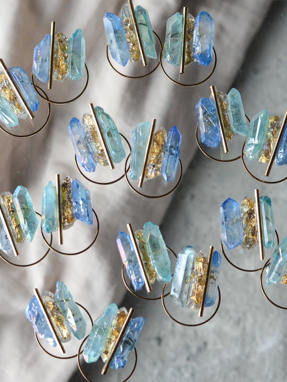 両サイドの天然石の間に、石をモールドで型取りラメやホロを封じたオリジナル樹脂パーツを組み合わせMIXさせています。
