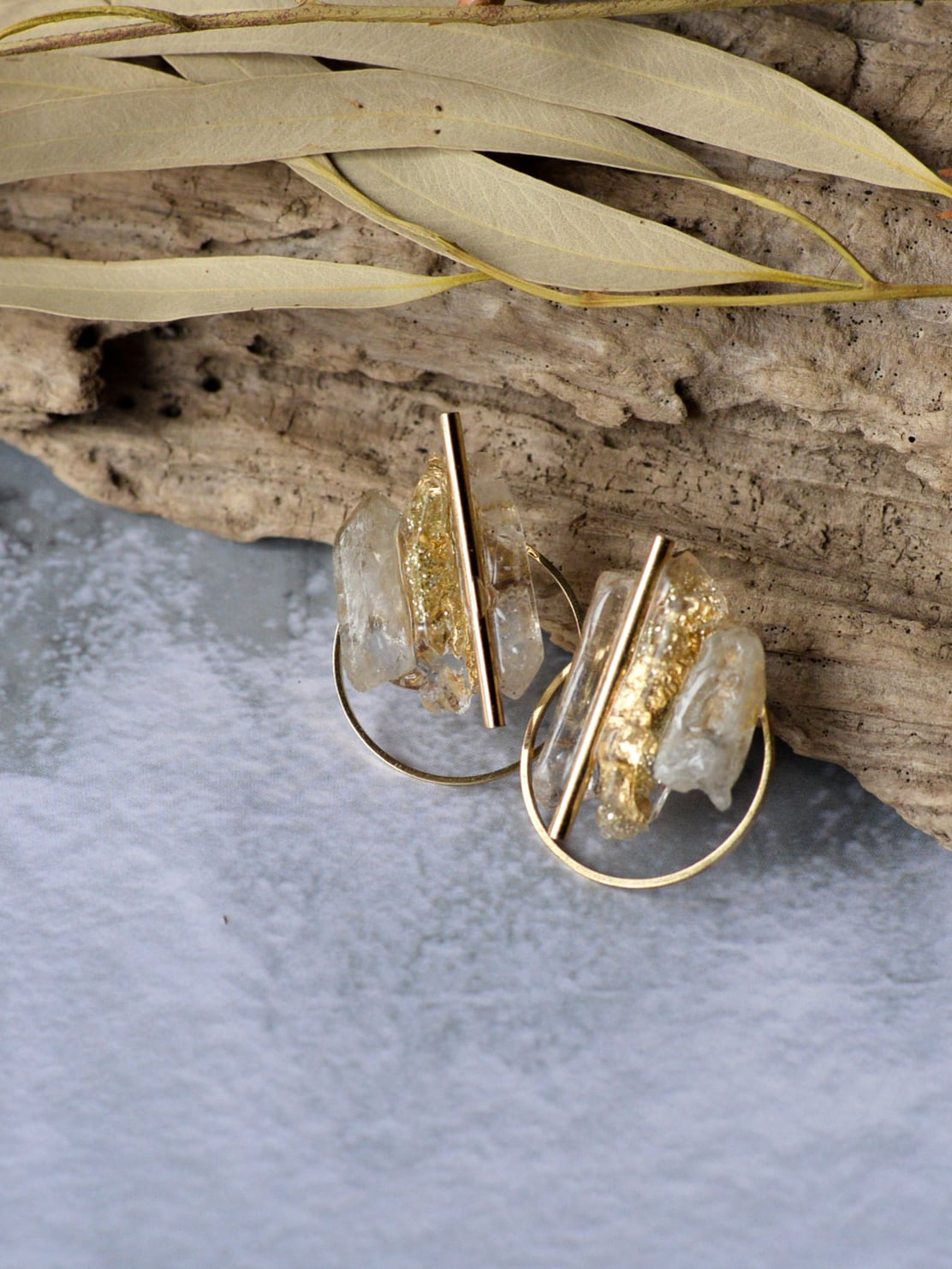 両サイドの天然石の間に、石をモールドで型取りラメやホロを封じたオリジナル樹脂パーツを組み合わせMIXさせています。