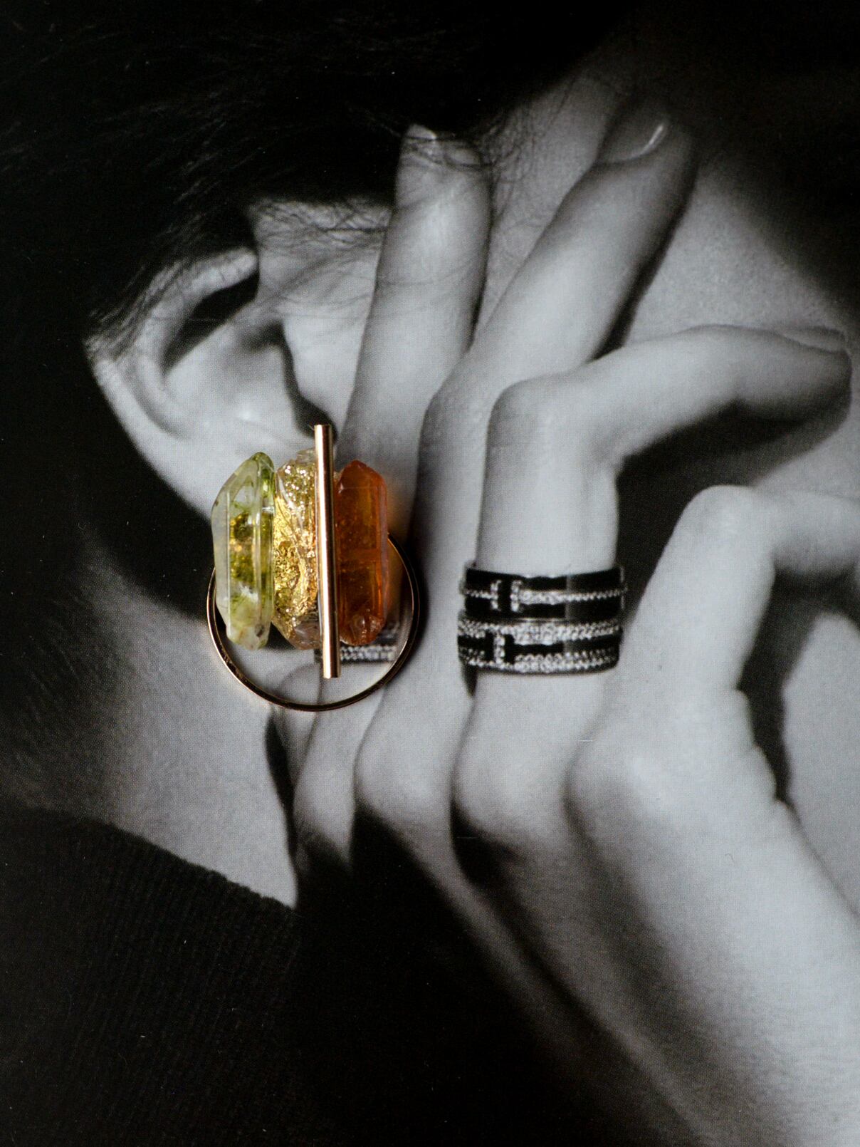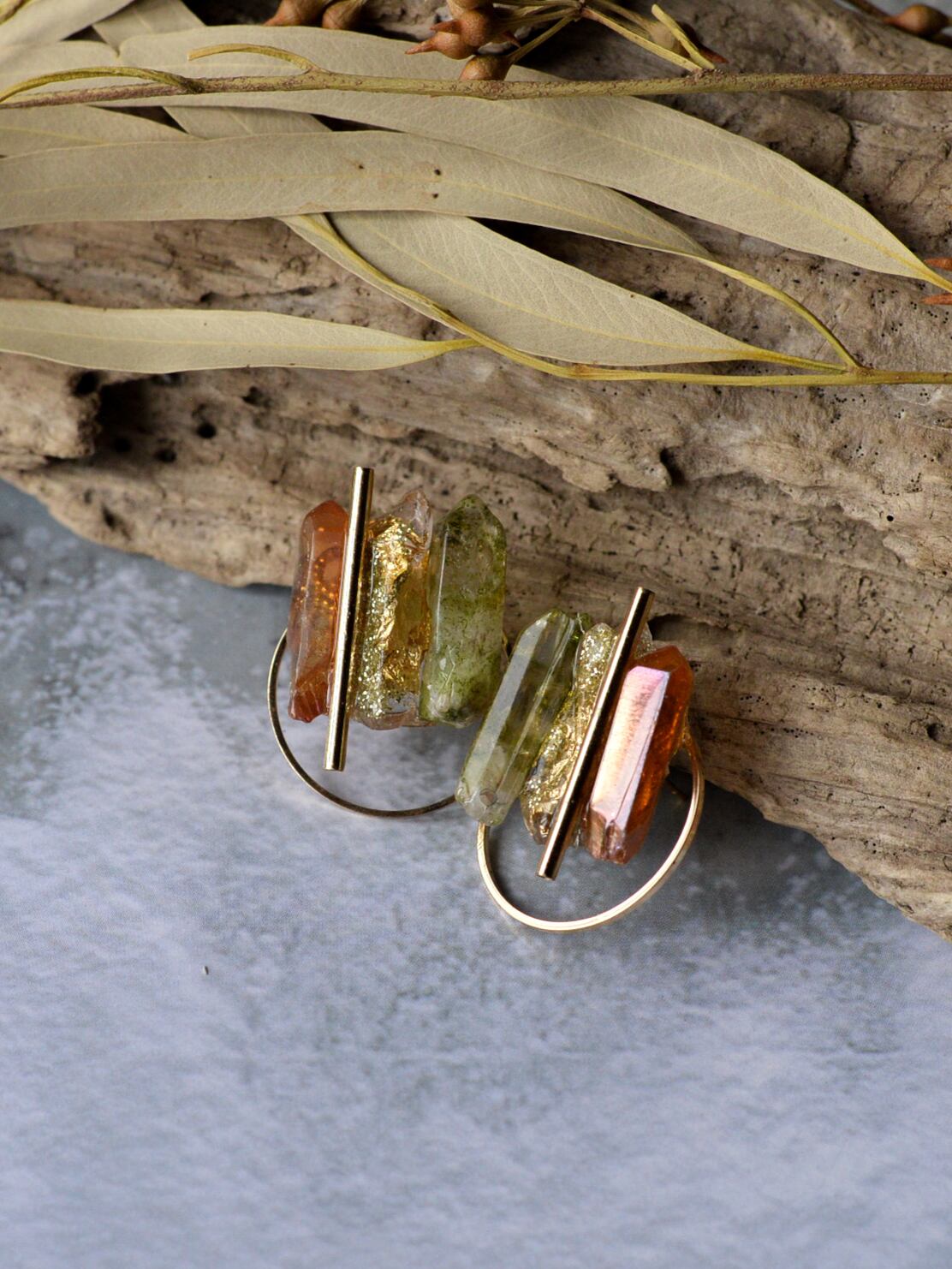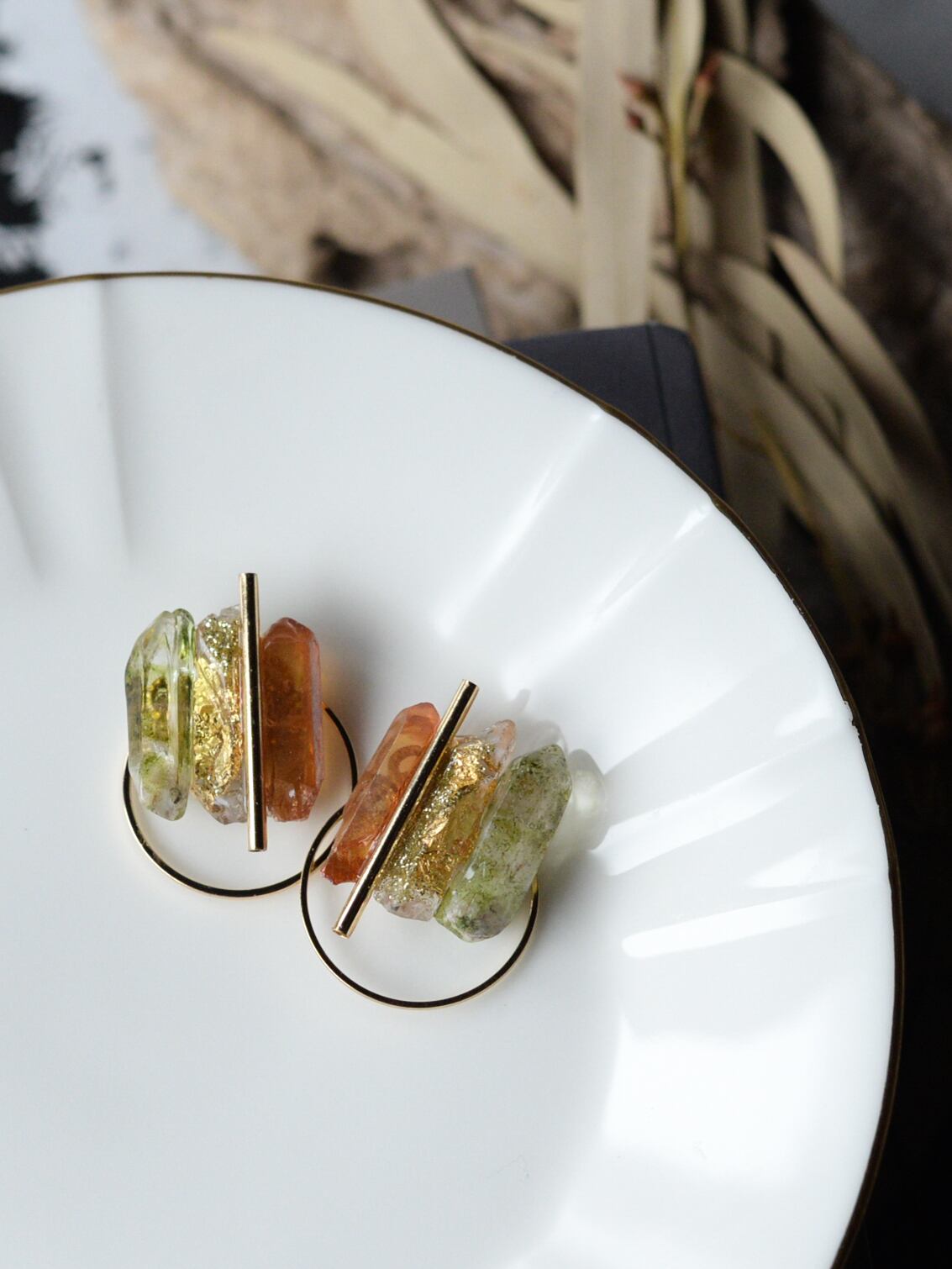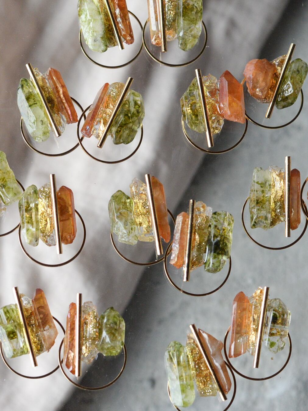 両サイドの天然石の間に、石をモールドで型取りラメやホロを封じたオリジナル樹脂パーツを組み合わせMIXさせています。