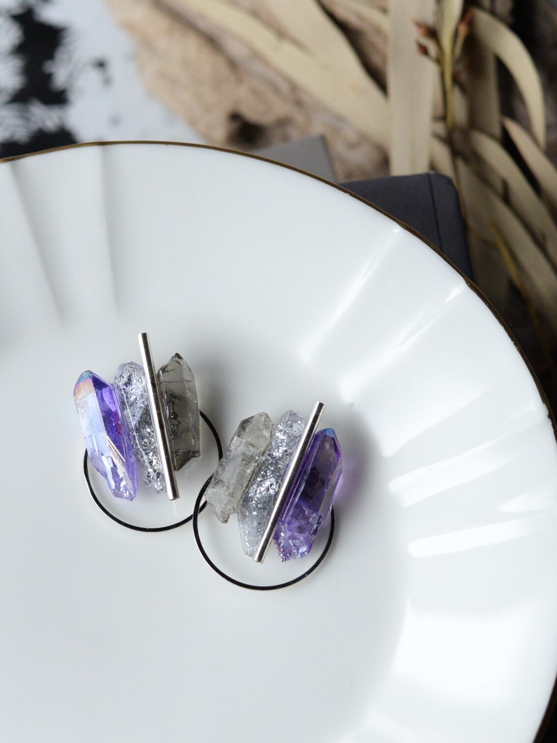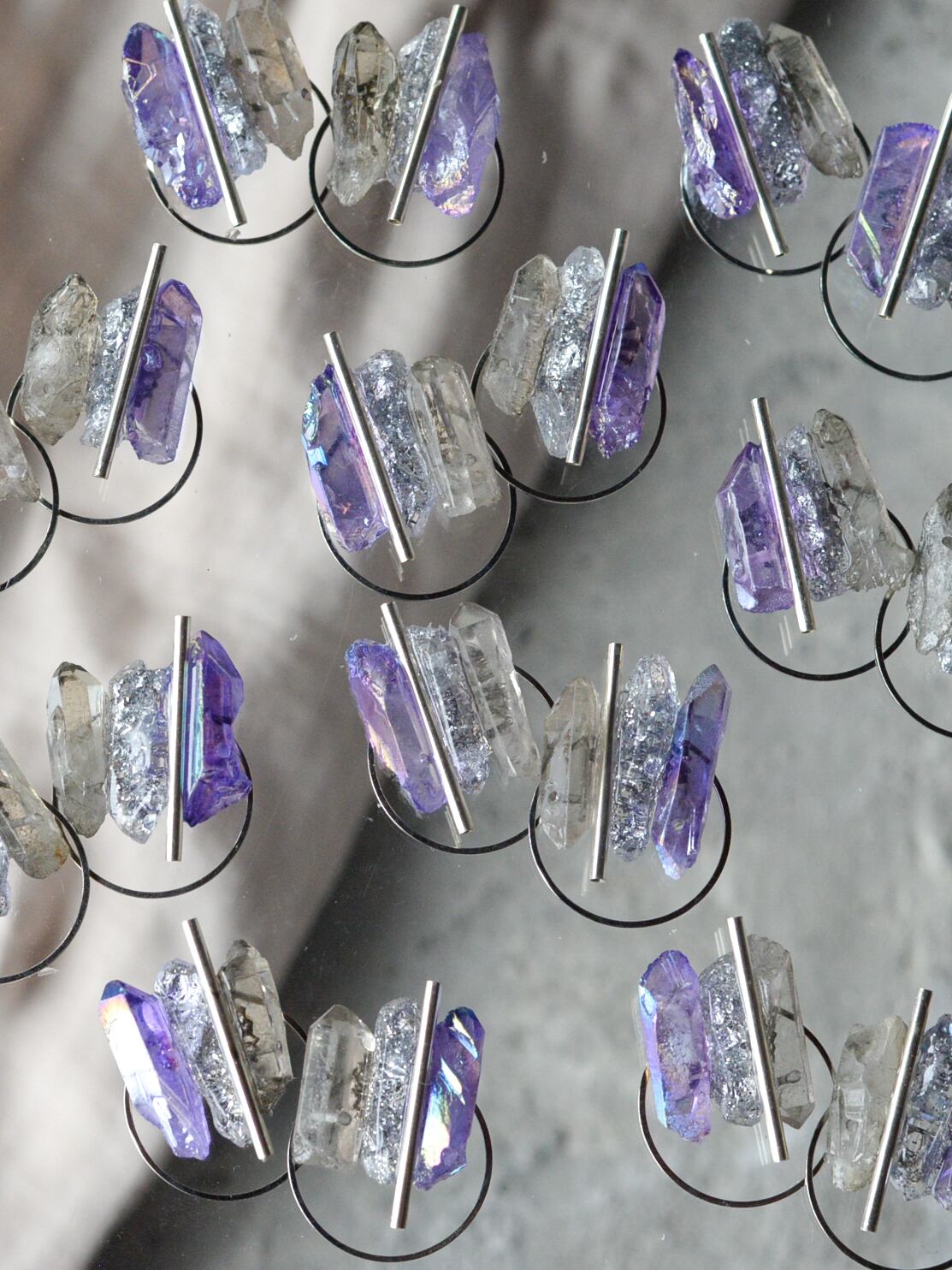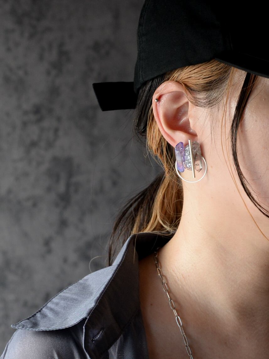 両サイドの天然石の間に、石をモールドで型取りラメやホロを封じたオリジナル樹脂パーツを組み合わせMIXさせています。