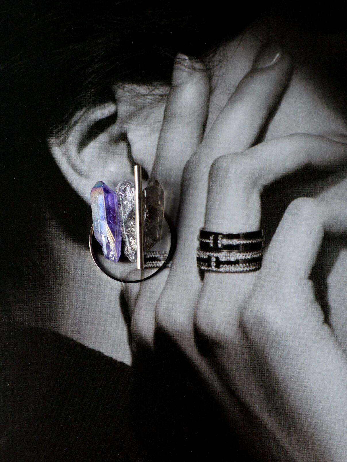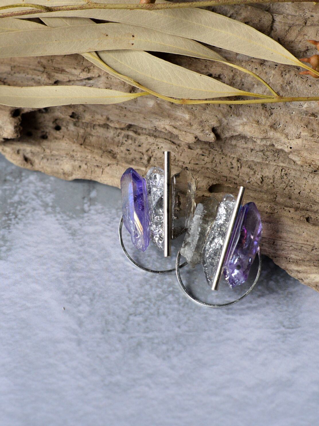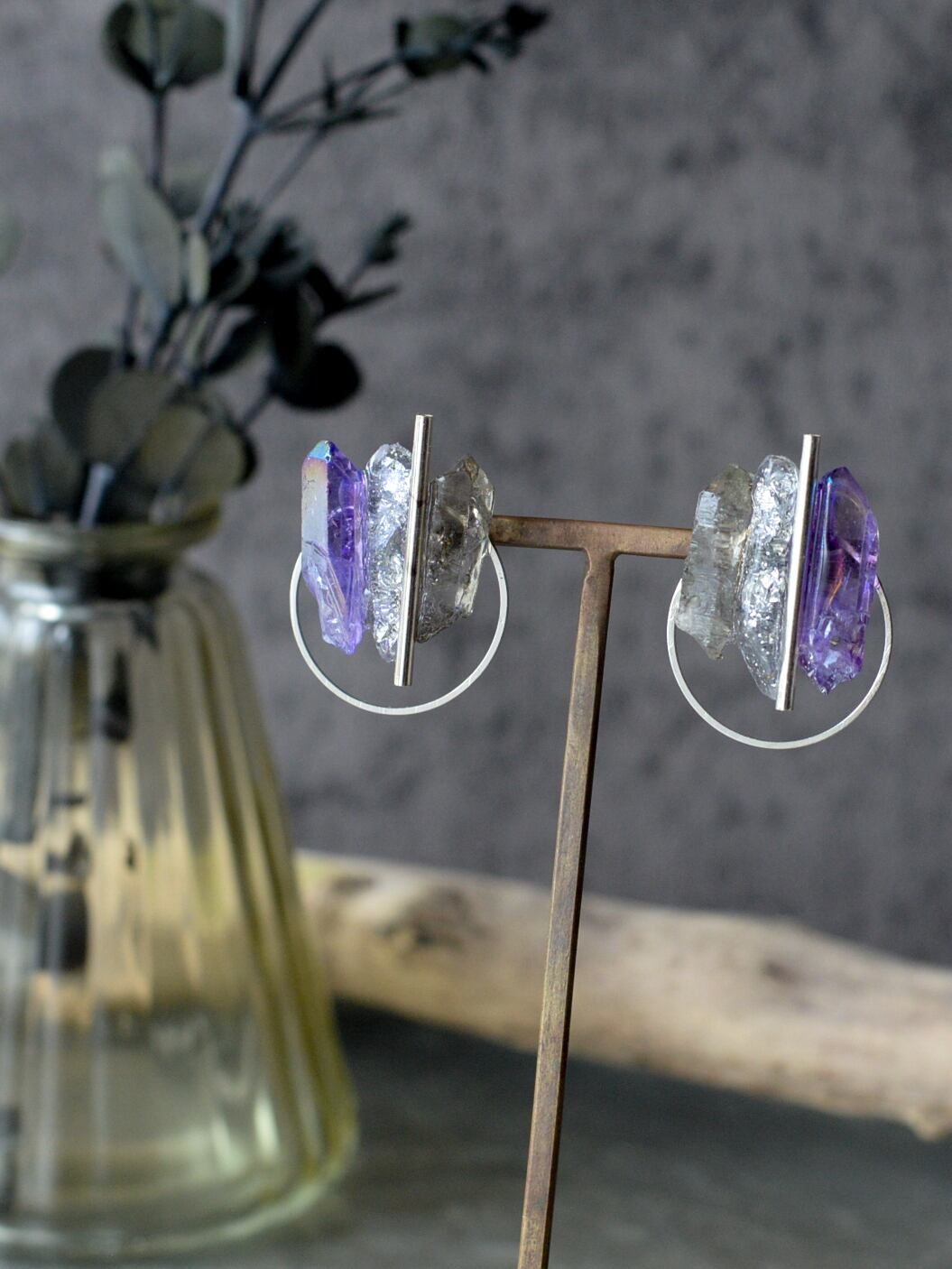 両サイドの天然石の間に、石をモールドで型取りラメやホロを封じたオリジナル樹脂パーツを組み合わせMIXさせています。