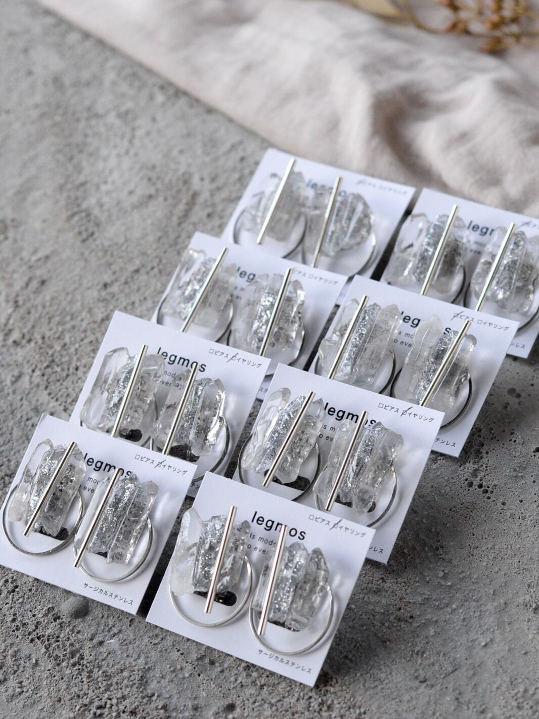 両サイドの天然石の間に、石をモールドで型取りラメやホロを封じたオリジナル樹脂パーツを組み合わせMIXさせています。