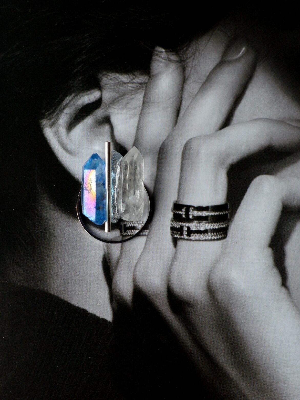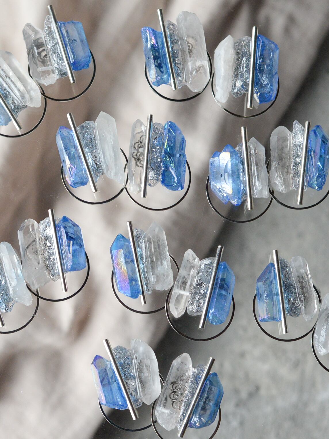 両サイドの天然石の間に、石をモールドで型取りラメやホロを封じたオリジナル樹脂パーツを組み合わせMIXさせています。