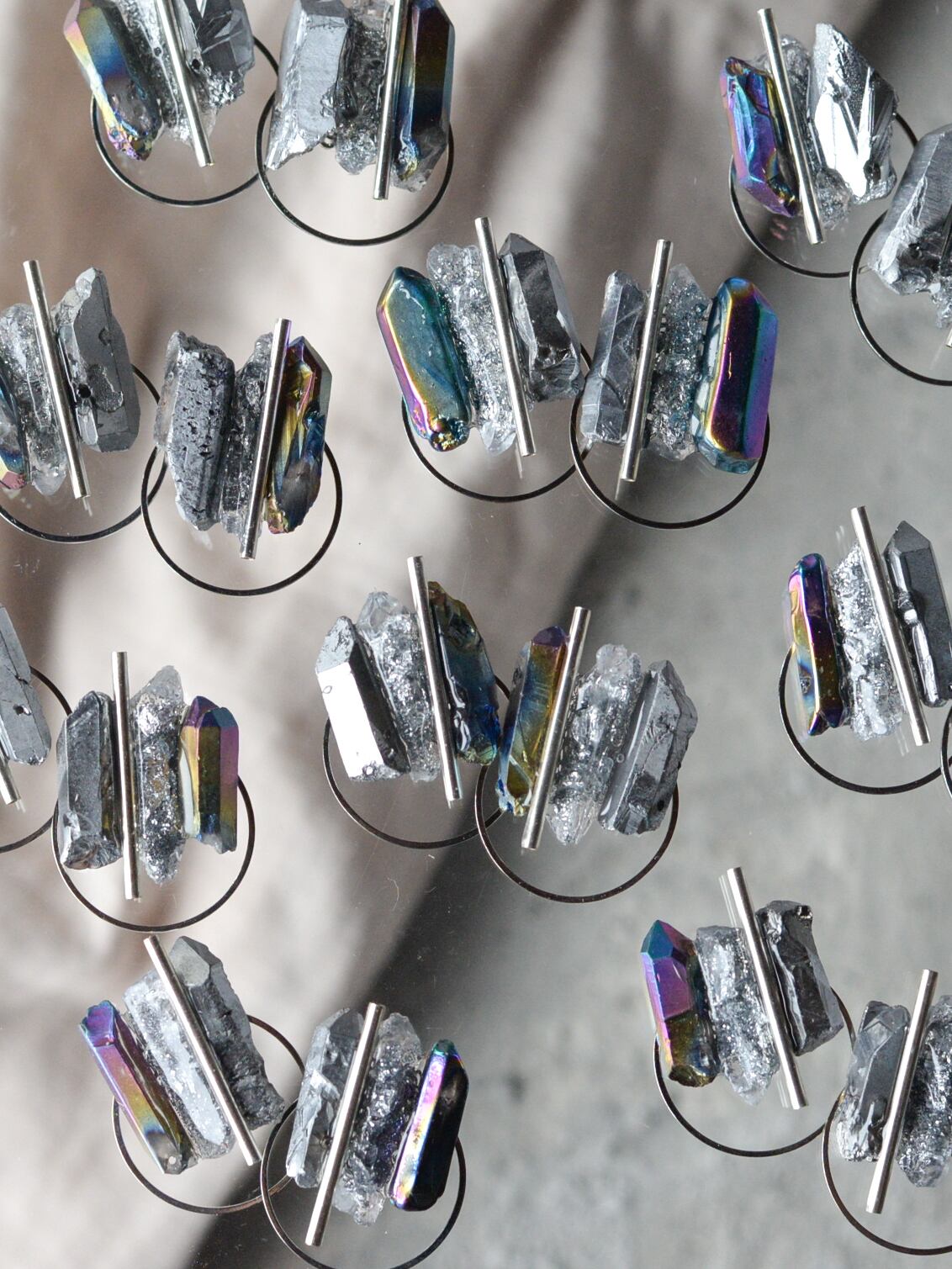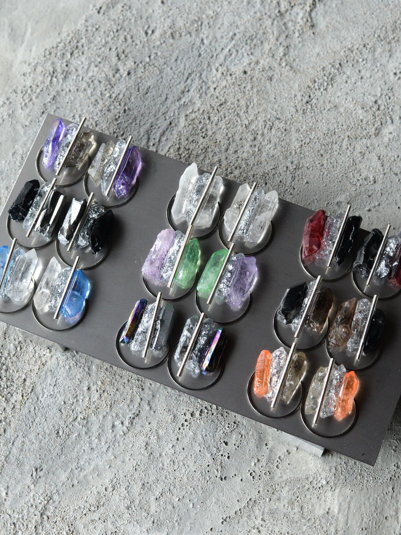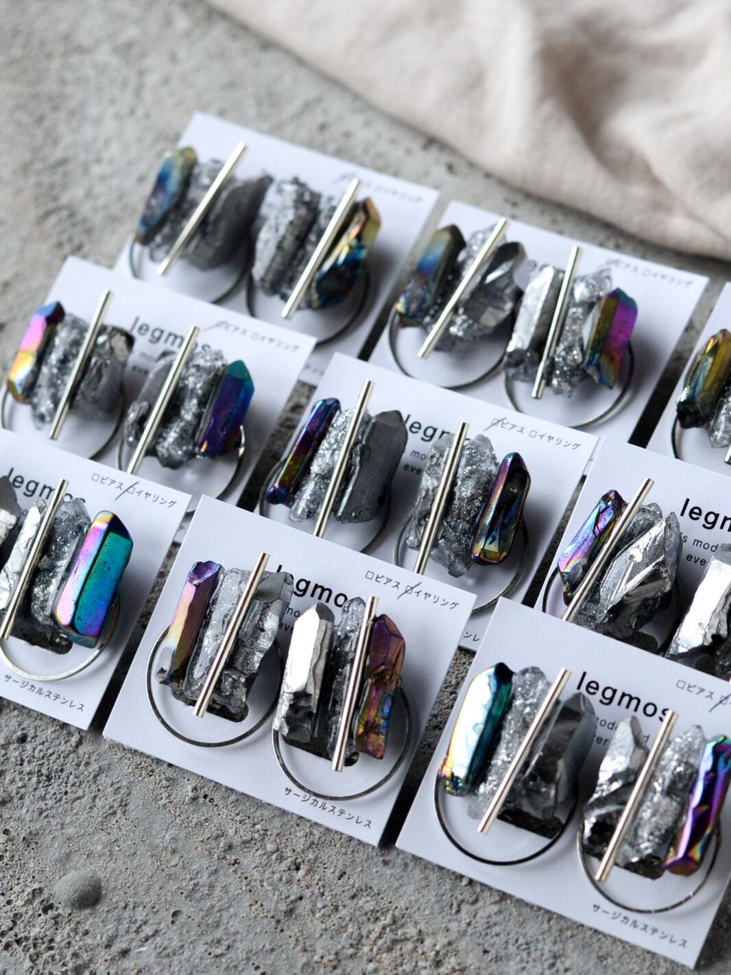 両サイドの天然石の間に、石をモールドで型取りラメやホロを封じたオリジナル樹脂パーツを組み合わせMIXさせています。