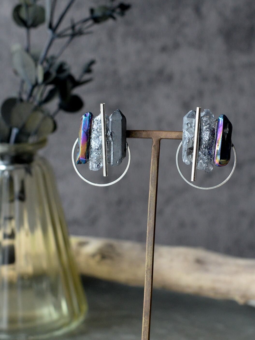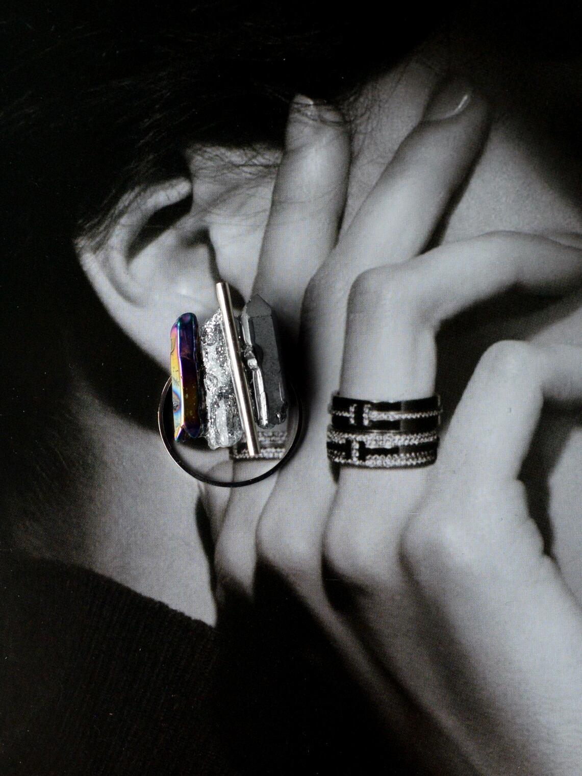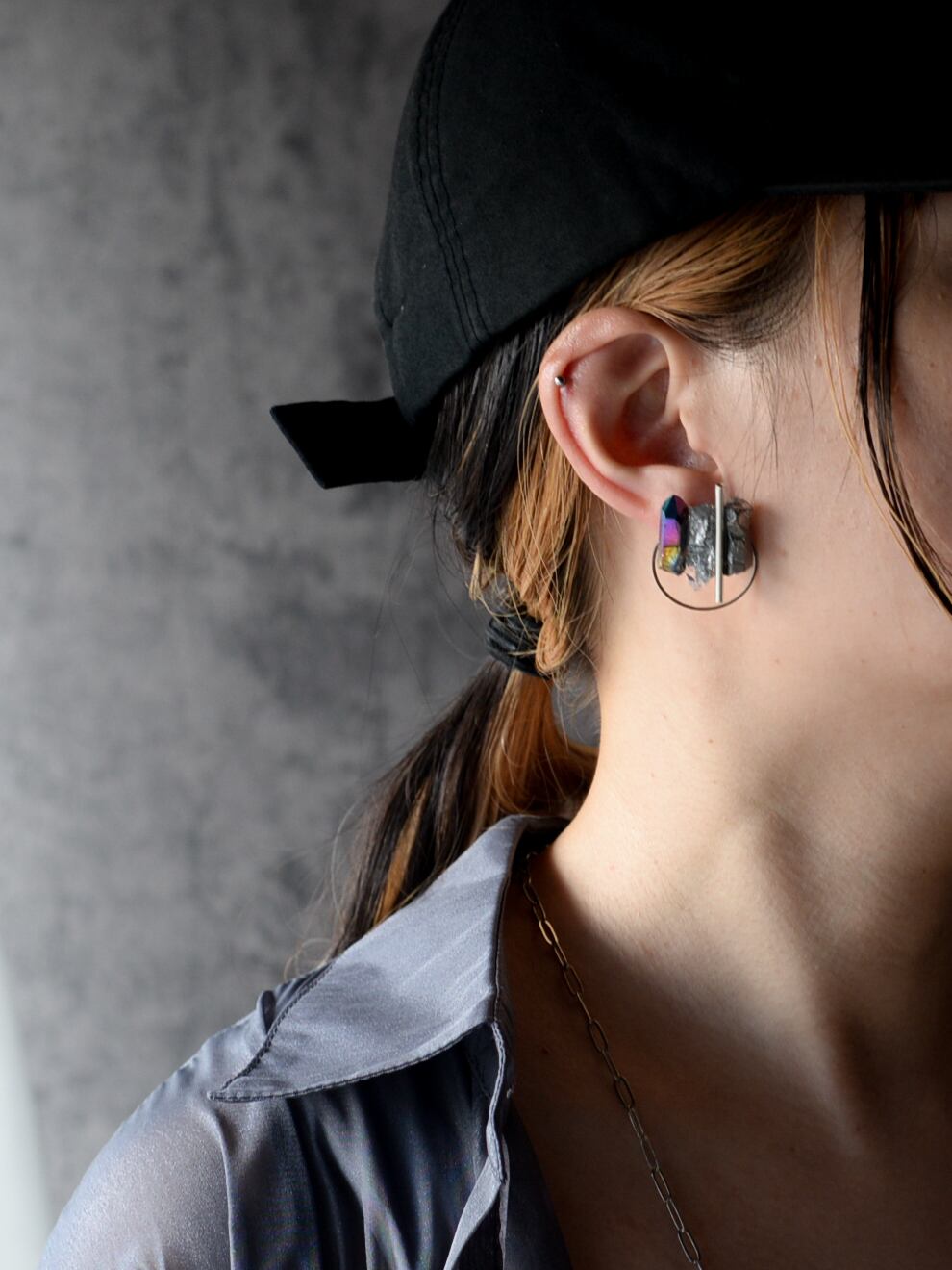両サイドの天然石の間に、石をモールドで型取りラメやホロを封じたオリジナル樹脂パーツを組み合わせMIXさせています。