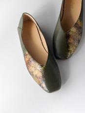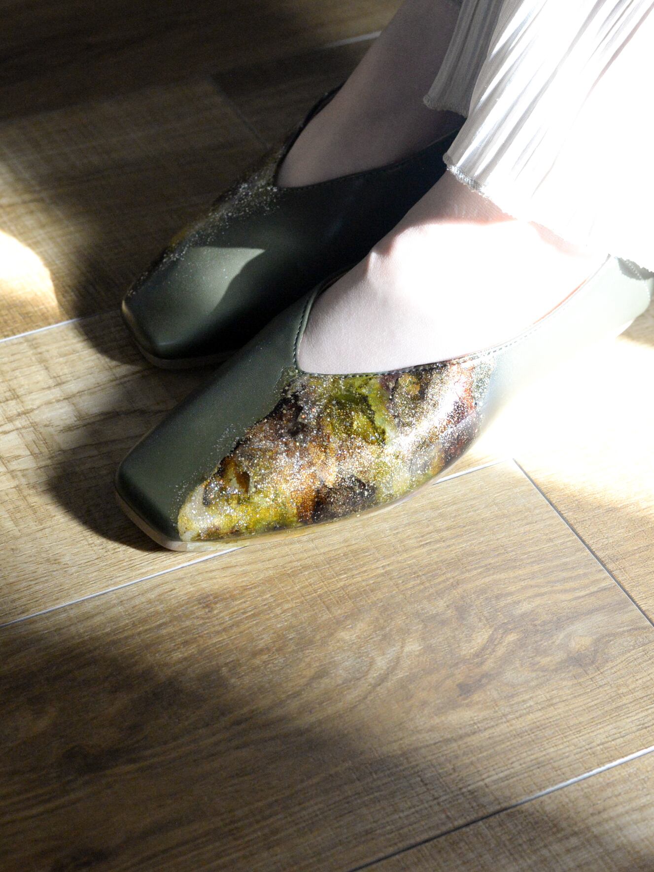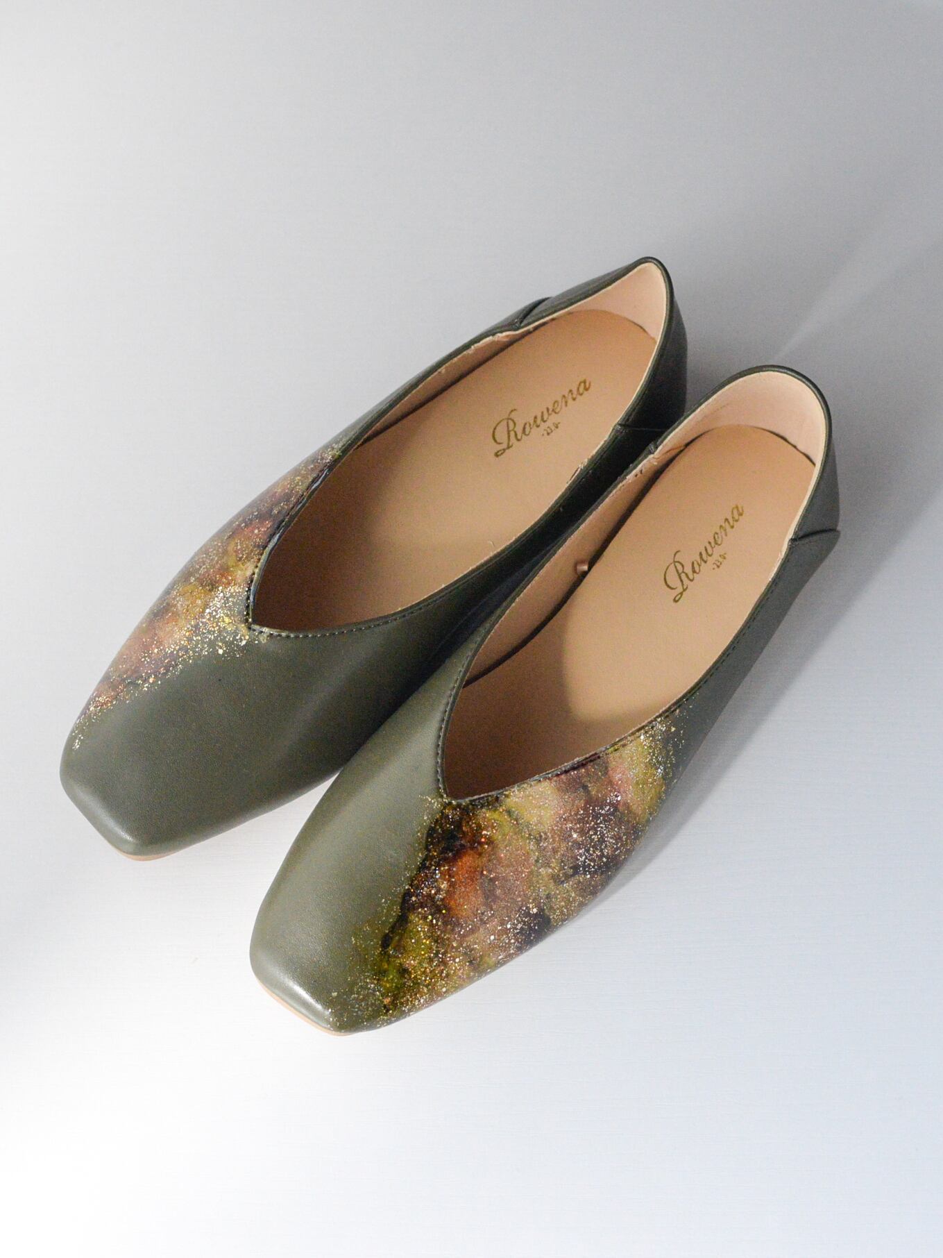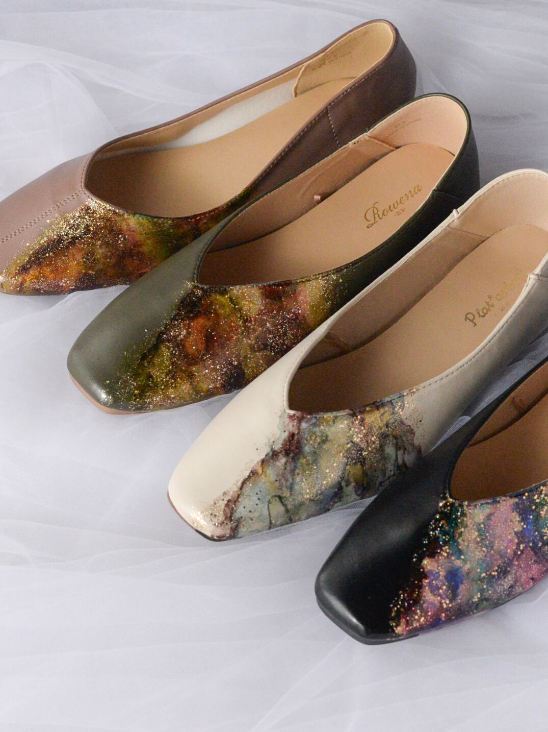ソフトで柔らかいレザーフラットパンプスにアルコールインクアートで天然石のようなニュアンスデザインを描き込みました。
